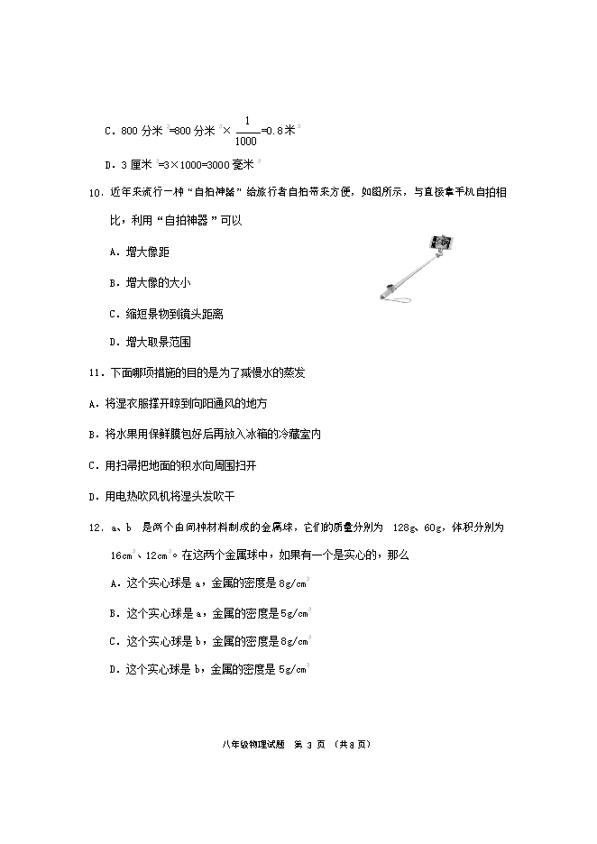 【内容简介】第Ⅰ卷选择题(共 36 分)一、选择题(每小题 3 分,共 36 分,在每小题给出的四个选项中,只有一项符合题意, 请选出并在答题卡上将该项涂黑)1.下列数据中,最接近生活实际的是A.人体正常体温约为 42℃B.食用油的密度约 0.9 千克/米 3C.一支新 2B 铅笔的长度约为 50cmD.一位普通初中生的质量约为 50kg 2.有关课堂上的声现象,下列说法正确的是A.老师的讲课声是由空气振动产生的 B.能听到老师的讲课声是由于空气能够传声 C.听录音时,调节音量按钮实质上是在改变声音的音调 D.关闭门窗是为了在声源处减弱噪声3.下列词语中涉及的光现象与“小孔成像”形成原因相同的是A.猴子捞月B.海市蜃楼C.凿壁偷光D.杯弓蛇影 4.密封的锤形玻璃泡内装有少量的碘颗粒,将玻璃泡浸人开水中,过一会儿玻璃泡内弥漫着紫红色的碘蒸气,下列现象中与上述碘发生的物态变化相同的是 A.正在消融的B.花朵上形成的C.冬天冰冻衣服D.冬天形成的 冰凌露珠晾干雾凇5.人类的生活和生产都离不开金属材料。下列金属制品中,主要利用金属导热性的是A.雕塑B.车模C.导线D.炒锅 6.甲、乙两种物体的质量和体积的关系图象如图所示,则甲、乙两物体的密度之比是A.8∶1B.4∶3C.4∶1D.2∶1 7.下列对生活中一些现象的解释错误的是A.用冰袋给高热病人降温,是因为冰熔化吸热 B.用手沾些冷水去拿包子不会太烫,是因为水汽化吸热 C.在寒冷的北方不用水银温度计测量气温,是因为水银的凝固点较低 D.舞台上用干冰能制造白雾,是因为干冰升华吸热使水蒸气液化8.下列情况中,物质密度不变的是A.把纸撕成碎片B.冰熔化成水C.氧气罐中的氧气用去一部分D.把铁丝烧红