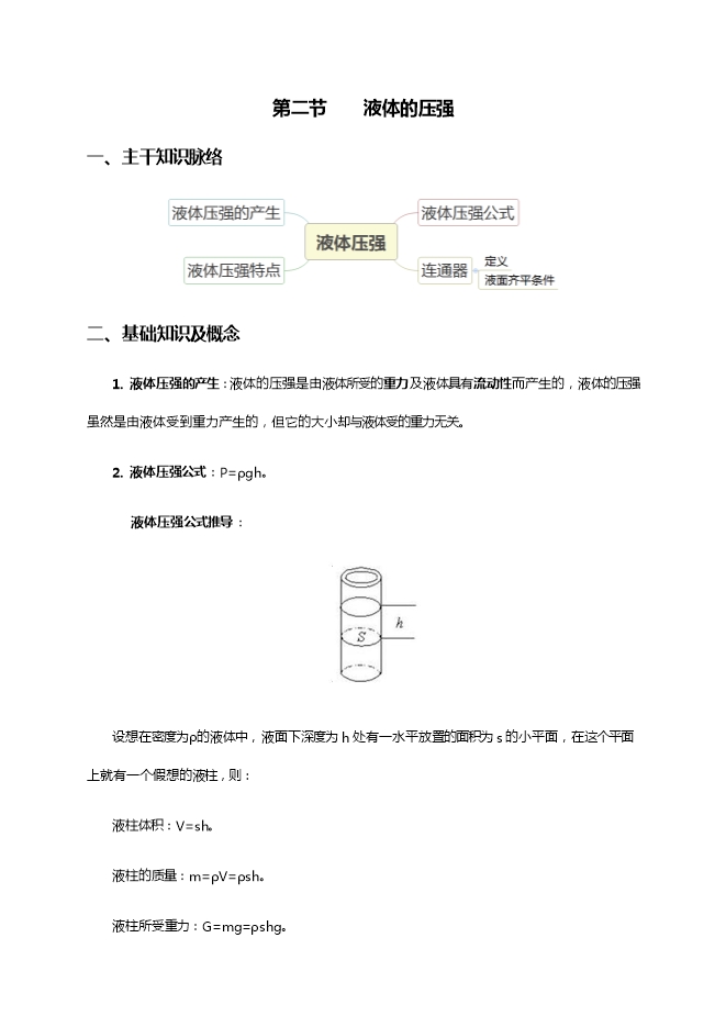 【内容简介】第二节 液体的压强一、主干知识脉络 二、基础知识及概念1. 液体压强的产生:液体的压强是由液体所受的重力及液体具有流动性而产生的,液体的压强虽然是由液体受到重力产生的,但它的大小却与液体受的重力无关。2. 液体压强公式:P=ρgh。 液体压强公式推导: 设想在密度为ρ的液体中,液面下深度为h处有一水平放置的面积为s的小平面,在这个平面上就有一个假想的液柱,则:液柱体积:V=sh。液柱的质量:m=ρV=ρsh。液柱所受重力:G=mg=ρshg。水平面所受的压力:F=G=ρshg。水平面所受的压强:P=F/S=ρgh。深入理解☆公式中P仅表示液体自身产生的压强。☆液体的深度h指的是液体中被研究点到自由液面的竖直距离,即一定要从液体跟空气的分界面竖直往下测量,它不是高度。判断出h的大小是计算液体压强的关键。3. 液体压强特点①液体对容器的底部和侧壁都有压强,液体内部向各个方向都有压强。 ②液体的压强随深度增加而增大,在同一深度,液体向各个方向的压强相等。 ③不同液体的压强还跟它的密度有关系。4. 连通器 定义:上端开口,下端连通的容器叫做连通器。 液面齐平条件:同种液体;不流动。深入理解☆连通器最终状态稳定后实质上是压强相等。三、实验小结1. 研究液体内部压强 图中所示图片为压强计,其原理为当金属盒上的橡皮膜受到挤压时,U型管两边的液面出现高度差;压强越大,两边的高度差越大,读出高度差即可得出压强计金属盒所处之处的压强。 实验结论:液体内部同一深度,向各个方向的压强都相等;深度越深压强越大;液体内部压强的大小还跟液体的密度有关,在深度相同时,液体的密度越大,压强越大。练一练1、下列装置及器材中,不属于应用连通器原理的是A. 液位计 B. 茶壶 C. 抽水机 D. 船闸2、1648年,帕斯卡曾做过一个著名的实验。如图所示,在装满水的密闭木桶的桶盖上,插入一根细长的管子,然后在楼房阳台上向细管子里灌水,结果只用几杯水就把木桶压裂了。该实验说明影响水产生压强大小的因素是( )
