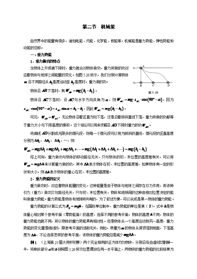 【内容简介】自然界中的能量有很多,诸如电能、内能、化学能、核能等。机械能是重力势能、弹性势能和动能的总称。一、重力势能1.重力做功的特点当物体上升或者下降时,重力就会对物体做功,重力所做的功对应着物体与地球之间能量的变化。如图5.28所示,我们分别计算物体 沿不同路径从 高度运动至 高度时,重力做的功。物体沿 下落时,有 。物体沿 下落时,设 与水平方向夹角为 ,则 ,因为 ,因此 。可见, ,无论物体沿着竖直方向下落,还是沿着倾斜直线下落,重力所做的功都等于重力大小与下降高度的乘积。这个结论可以用来求解沿 下降时重力的功 。将曲线 分割成无限多的微元段,则每一个微元段可以视为倾斜的直线,微元段的竖直高度分别为 , , ,…,则 综上可知,重力做功与物体的移动路径无关,只与物体的初、末位置的高度差有关,可以用 来计算重力做的功,其中 表示物体在初、末位置的高度差,如果物体有一定的形状和大小,则 表示物体的重心在初、末位置的高度差。2.重力势能的定义重力做功时,对应着物体能量的变化。这种能量是由于物体与地球之间存在引力作用,而该种引力(重力)做功又与路径无关,只与初、末位置有关,物体和地球间的这种由相对位置决定的能叫做重力势能。重力势能是物体和地球所共有的,为了叙述方便,可以说成是某一物体的重力势能。重力势能的计算公式为 ,在国际单位制中,重力势能的单位是焦( )。式中 是物体重心相对某个参考平面(零势能面)的高度,选择不同的参考平面,物体的高度 不同,物体的重力势能也就不同,所以物体的重力势能具有相对性。但是物体从一个高度运动到另一高度,重力势能的变化量是绝对的,跟参考平面的选取无关,例如,质量为 的物体从房顶落到地面,下落高度为 ,不论选择怎样的参考平面,该物体的重力势能总是减少 。例1 (上海第27届大同杯初赛)两个完全相同的正方体均匀物块,分别沿各自虚线切割掉一半,将剩余部分 和 按照图5.29所示位置摆放在同一水平面上,两物块的重力势能的比较结果为( )。A. 比较大B. 比较大C.一样大D.无法判断分析与解 和 质量相同,比较它们重力势能的大小,只需比较两者的重心高度即可。设原来正方体的边长为 ,则 的重心高度为 。 的重心高度等于图中等腰直角三角形的重心高度,而三角形的重心在底边中线上,且重心距底边的距离为 的中线长度,因此 重心的高度 ,显然,选项 正确。例2 一根质量为 、长为 的均匀链条一半放在光滑的水平桌面上,另一半挂在桌边,桌面足够高,若在链条两端和中央各挂一个质量为 的小球,如图5.30所示。由静止释放,当链条刚离开桌面时,重力做功为________,系统重力势能变化量为________。
