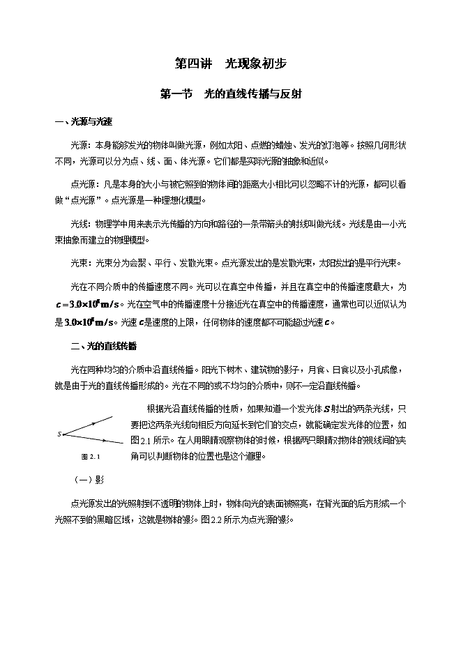 【内容简介】一、光源与光速光源:本身能够发光的物体叫做光源,例如太阳、点燃的蜡烛、发光的灯泡等。按照几何形状不同,光源可以分为点、线、面、体光源。它们都是实际光源的抽象和近似。点光源:凡是本身的大小与被它照到的物体间的距离大小相比可以忽略不计的光源,都可以看做“点光源”。点光源是一种理想化模型。光线:物理学中用来表示光传播的方向和路径的一条带箭头的射线叫做光线。光线是由一小光束抽象而建立的物理模型。光束:光束分为会聚、平行、发散光束。点光源发出的是发散光束,太阳发出的是平行光束。光在不同介质中的传播速度不同。光可以在真空中传播,并且在真空中的传播速度最大,为 。光在空气中的传播速度十分接近光在真空中的传播速度,通常也可以近似认为是 。光速 是速度的上限,任何物体的速度都不可能超过光速 。二、光的直线传播光在同种均匀的介质中沿直线传播。阳光下树木、建筑物的影子,月食、日食以及小孔成像,就是由于光的直线传播形成的。光在不同的或不均匀的介质中,则不一定沿直线传播。根据光沿直线传播的性质,如果知道一个发光体 射出的两条光线,只要把这两条光线向相反方向延长到它们的交点,就能确定发光体的位置,如图2.1所示。在人用眼睛观察物体的时候,根据两只眼睛对物体的视线间的夹角可以判断物体的位置也是这个道理。(一)影点光源发出的光照射到不透明的物体上时,物体向光的表面被照亮,在背光面的后方形成一个光照不到的黑暗区域,这就是物体的影。图2.2所示为点光源的影。 影区是发自光源并与被照物体的表面相切的光线围成的。如果用一个发光面比较大的光源来代替点光源,影的情形就会不同。发光面上的每个发光点都可以看做一个点光源,它们都在物体的背后造成影区,这些影共有的完全不会受到光照射的范围叫做本影。本影的周围还有一个能受到光源发出的一部分光照射的区域,叫做半影。图2.3所示为面光源的本影与半影。光源的发光面越大,本影区越小。(二)日食和月食发生日食时,太阳、月球和地球位于同一直线上,月球在中间。太阳发出的光线经月球遮挡后,形成如图2.4所示的 , , , 四个影区,其中 为本影区,没有光线能够照射到该区域, 为伪本影区,只有太阳边缘发出的光线可以照射到该区域, 和 为半影区。当地球上的观察者位于 区域内时,将观察到日全食,位于 区域时,可以观察到日环食,位于 和 区域时则可以观察到日偏食。 发生月食时,太阳、地球和月球位于同一直线上,地球在中间,如图2.5所示。当月球有一部分进入地球的本影区时,在本影区的部分由于没有光线到达,因此该部分不能被看到,形成月偏食。当月球全部进入地球的本影区 时,由于没有太阳的光线照射到月球表面,月球也不再反光,因此地球上的观察者会看到月全食。在月食现象中,不可能出现月环食。