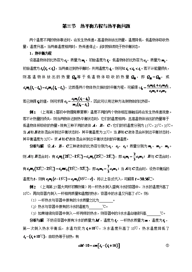 第六讲 热学 第三节 热平衡方程与热平衡问题-2021年初中物理竞赛及自主招生专题讲义(附详解)