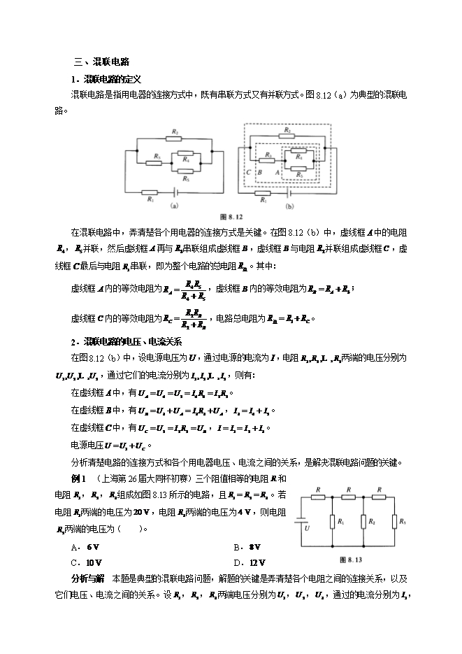 【内容简介】在电路中,用电器按照不同的方式连接起来,就组成了串联、并联和混联电路。不同连接方式所对应的电压、电流等的规律也不相同。一、串联电路1.串联电路的定义串联电路是指各用电器沿着单一路径顺次连接在一起,电流只沿着一条路径流动的电路。图8.10为常见的串联电路。2.串联电路的规律以图8.10为例,设串联电路的总电压为 ,总电流为 ,各电阻两端电压分别为 , , ,流过各电阻的电流分别为 , , ,串联的总电阻为 ,则申联电路的规律可总结如下:(1)串联电路电流处处相等: 。(2)串联电路两端总电压等于各电阻两端电压之和: 。(3)串联电路的总电阻等于各电阻之和: ;串联电路的总电阻大于其中任何一个电阻,串联电路中任一电阻增大,总电阻也增大。(4)串联电路各电阻两端的电压与其阻值成正比: 。二、并联电路1.并联电路的定义各用电器连接时,首端连接在一起作为首端,尾端连接在一起作为尾端,电流分别流过各个用电器的电路叫做并联电路。图8.11为常见的并联电路。2.并联电路的规律以图8.11为例,设并联电路总电压为 ,总电流为 ,各电阻两端电压分别为 , , ,流过各电阻的电流分别为 , , ,并联的总电阻为 ,则并联电路的规律可总结如下:(1)并联电路各电阻(或支路)两端电压相等: 。(2)并联电路干路上的电流等于各支路电流之和: 。(3)并联电路的总电阻的倒数等于各支路电阻倒数之和: ;并联电路的总电阻小于任何一个支路电阻,且总电阻与最小的支路电阻更接近。并联电路中任一电阻增大,总电阻也增大。(4)并联电路各电阻通过的电流与电阻阻值成反比: 。三、混联电路1.混联电路的定义混联电路是指用电器的连接方式中,既有串联方式又有并联方式。图8.12(a)为典型的混联电路。 在混联电路中,弄清楚各个用电器的连接方式是关键。在图8.12(b)中,虚线框 中的电阻 , 并联,然后虚线框 再与 串联组成虚线框 ,虚线框 与电阻 并联组成虚线框 ,虚线框 最后与电阻 串联,即为整个电路的总电阻 。其中:虚线框 内的等效电阻为 ,虚线框 内的等效电阻为 ;虚线框 内的等效电阻为 ,电路总电阻为 。2.混联电路的电压、电流关系在图8.12(b)中,设电源电压为 ,通过电源的电流为 ,电阻 两端的电压分别为 ,通过它们的电流分别为 ,则有:在虚线框 中,有 。在虚线框 中,有 , 。在虚线框 中,有 , 。电源电压 。分析清楚电路的连接方式和各个用电器电压、电流之间的关系,是解决混联电路问题的关键。例1  (上海第26届大同杯初赛)三个阻值相等的电阻 和电阻 , , 组成如图8.13所示的电路,且 。若电阻 两端的电压为 ,电阻 两端的电压为 ,则电阻 两端的电压为(    )。A. B. C. D. 分析与解  本题是典型的混联电路问题,解题的关键是弄清楚各个电阻之间的连接关系,以及它们电压、电流之间的关系。设 , , 两端电压分别为 , , ,通过的电流分别为 , , ,根据电路图,电阻 与 串联后再与 并联,则有
