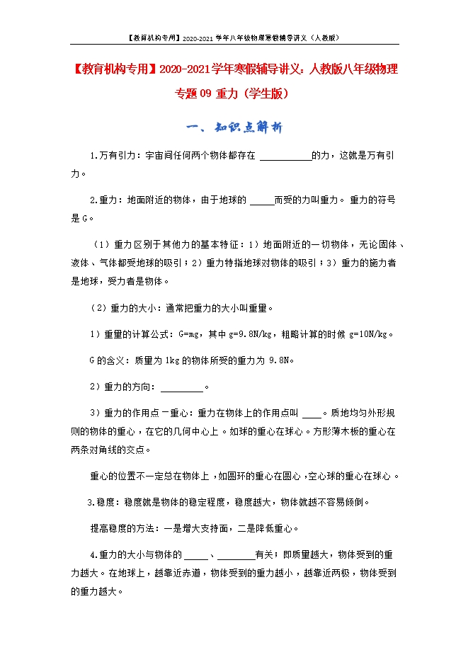 【教育机构专用】2020-2021学年寒假辅导讲义:人教版八年级物理专题09 重力(教师版和学生版)