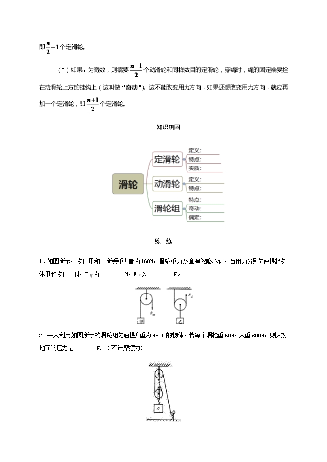 【内容简介】二、基础知识及概念1.滑轮:周边有槽,中心有一转动轴的轮子叫滑轮。 定滑轮:轴的位置固定不动的滑轮称为定滑轮。使用定滑轮虽然不能省力,但可以改变用力方向。 深入理解☆滑轮可看作是能够连续旋转的杠杆。☆把一条直径看成杠杆,圆心就是杠杆的支点,定滑轮实质是等臂杠杆。☆定滑轮的特点它的转轴(支点)不随货物上下移动。2. 动滑轮 轴的位置随被拉物体一起运动的滑轮称为动滑轮。特点是它的转动轴会随物体上下移动。 深入理解☆它实质是动力臂为阻力臂2倍的省力杠杆,它的转动轴是阻力作用点。☆使用动滑轮可以省力,但要多移动距离。3. 滑轮组 把定滑轮和动滑轮组合在一起,构成滑轮组。特点:既可省力,又可以改变用力方向。但费距离。深入理解☆滑轮组的省力多少由绳子股数决定,重物和动滑轮的总重由n股绳子承担,提起重物所用的力就是总重的1/n。滑轮组设计要点 (1)根据绳的段数,确定动滑轮的个数:一个动滑轮可拉2段绳,还能改变用力方向;也可以拉三段绳,但不能改变用力方向。 (2)如果需要n段绳(n为偶数)那么就需要n/2个动滑轮和n/2个定滑轮穿绳组装时,绳的固定端要固定在定滑轮下的挂钩上(这叫做“偶定”)。若不改变力的方向,还可少用一个定滑轮,即 个定滑轮。 (3)如果n为奇数,则需要 个动滑轮和同样数目的定滑轮,穿绳时,绳的固定端要拴在动滑轮上方的挂钩上(这叫做“奇动”)。这不能改变用力方向,如果还想改变用力方向,就应再加一个定滑轮,即 个定滑轮。知识巩固 练一练1、如图所示,物体甲和乙所受重力都为160N,滑轮重力及摩擦忽略不计,当用力分别匀速提起物体甲和物体乙时,F甲为________ N,F乙为________ N。 2、一人利用如图所示的滑轮组匀速提升重为450N的物体,若每个滑轮重50N,人重600N,则人对地面的压力是________N.(不计摩擦力) 3、如图,A物重100N,在力F的作用下,以5m/s的速度在水平面上匀速向右运动,此时弹簧秤的示数为10N,则A物体受到的摩擦力是 N;拉力F为 N;拉力在10s内所做的功为 J. 4、利用定滑轮提起重物,沿着如图所示方向的F1、F2、F3来施力拉绳子时拉力大小的关系是F1______F2______F3(以上两空选填“=”或“≠”),这是因为F1、F2、F3的力臂______(选填“相等”或“不等”).