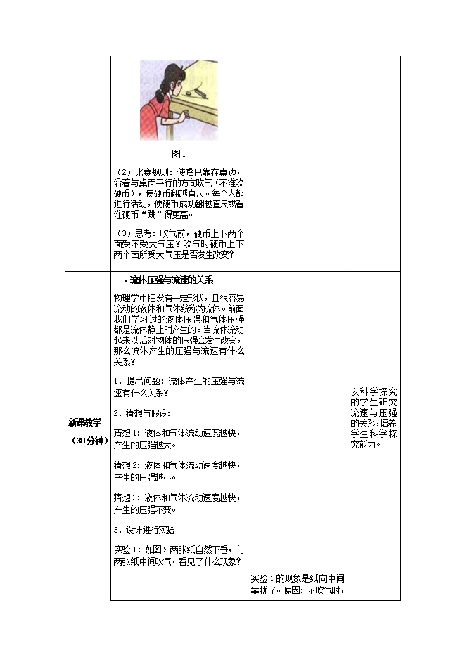 【内容简介】一、教学目标1.通过实验,能总结出流体的压强与流速的关系。2.在观察实验的过程中,培养学生实事求是、尊重自然规律的科学态度。二、教学重难点教学的重点是流体压强与流速的关系,难点是利用流体压强与流速的关系解释相关现象。三、教学策略流体压强与流速有关,学生这方面的生活经验并不多。因此,教学时尽量选取操作简单、现象明显、直观且生动有趣的小实验,引导学生把压力、压强跟流速联系起来,了解流体压强与流速的关系及其在生活中的应用。对于飞机的升力,可以通过制作小小的机翼模型并进行分析,进一步说明气体压强与流速的关系,让学生体会科学原理的价值。四、教学资源准备多媒体课件、一角硬币、直尺、两个乒乓球、细线、蜡烛、火柴、两根塑料吸管、两张纸、机翼模型。五、教学过程教学环节教师活动学生活动设计意图导入新课(5分钟)做两个“漏斗”吹球球不走的小实验:准备两个漏斗,一个漏斗朝上放置,一个漏斗朝下放置。把乒乓球放置于漏斗中间,往漏斗里吹气。事先让同学猜想,球会不会被吹走,球会不会掉下来,然后再实验。学生活动:硬币“跳高”比赛(1)比赛设计:如图1,将一枚一角硬币放在离桌边5cm处,在硬币前10cm处用直尺架高约2cm。 图1(2)比赛规则:使嘴巴靠在桌边,沿着与桌面平行的方向吹气(不准吹硬币),使硬币翻越直尺。每个人都进行活动,使硬币成功翻越直尺或看谁硬币“跳”得更高。(3)思考:吹气前,硬币上下两个面受不受大气压?吹气时硬币上下两个面所受大气压是否发生改变?学生猜想、观赏、体验有关的现象。 针对问题积极思考,并尝试回答:吹气前,硬币上表面受向下的大气压,下表面受向上的大气压,它们大小相等,相互抵消。吹气时硬币向上“跳”,说明硬币受到向上的压强比较大,这可能是硬币上表面受到的压强减小造成的。因为吹气,加快了硬币上方空气的流动速度 实验现象与学生猜想不一致,激发学生强烈的好奇心,激发学生强烈的学习动机。 新课教学(30分钟)一、流体压强与流速的关系物理学中把没有一定形状,且很容易流动的液体和气体统称为流体。前面我们学习过的液体压强和气体压强都是流体静止时产生的。当流体流动起来以后对物体的压强会发生改变,那么流体产生的压强与流速有什么关系?1.提出问题:流体产生的压强与流速有什么关系? 2.猜想与假设: 猜想1:液体和气体流动速度越快,产生的压强越大。 猜想2:液体和气体流动速度越快,产生的压强越小。猜想3:液体和气体流动速度越快,产生的压强不变。 3.设计进行实验 实验1:如图2两张纸自然下垂,向两张纸中间吹气,看见了什么现象? 图2实验2:杯子里放入乒乓球,往杯口水平吹气,能否让乒乓球在杯子之间跳跃,试一下看看。实验3:如图3,将事先折好的两只小船,放入脸盆内,然后用注射器向船中间的水域冲水,两船如何运动? 图3一组选其中一个实验探究,做完后可以探究其它实验。 4.交流与合作请每小组派一个代表就刚才的实验,上来重新演示,说说观察到的实验现象,并发表一下自己的看法。5.结论:流体在流速大的地方压强较小,在流速小的地方压强较大。 利用流体压强与流速的关系解释现象:(1)在火车站或地铁站的站台上,离站台边缘1m左右的地方标有一条黄色的安全线,乘客必须站在安全线以外的地方候车,这是为什么?(2)狂风发作时,经常会揭起屋顶的瓦片,这是为什么? (3)夏季我们经常把 门窗打开,“过堂风”让我们凉爽 不已。可是风却经常把门给关上,你能解释这个现象吗?(4)1912年秋季的某一天,当时世界上最大的远洋海轮──“奥林匹克号”正航行在大海上。在离“奥林匹克号”100米远的地方,有一艘比它小得多的铁甲巡洋舰“豪克号”与它平行疾驶着。这时却发生了一件意外事情:小船好像被大船吸过去似的,完全失控,一个劲儿地向“奥林匹克号”冲去。小船怎么会被大船“吸”过去呢?