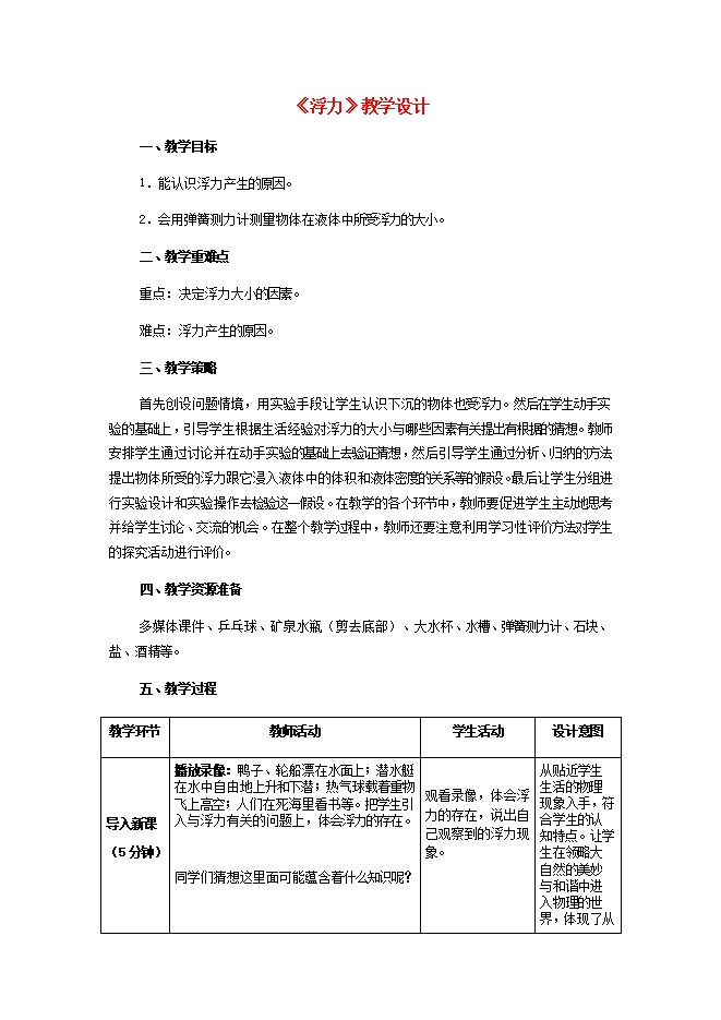 【内容简介】一、教学目标1.能认识浮力产生的原因。2.会用弹簧测力计测量物体在液体中所受浮力的大小。二、教学重难点重点:决定浮力大小的因素。难点:浮力产生的原因。三、教学策略首先创设问题情境,用实验手段让学生认识下沉的物体也受浮力。然后在学生动手实验的基础上,引导学生根据生活经验对浮力的大小与哪些因素有关提出有根据的猜想。教师安排学生通过讨论并在动手实验的基础上去验证猜想,然后引导学生通过分析、归纳的方法提出物体所受的浮力跟它浸入液体中的体积和液体密度的关系等的假设。最后让学生分组进行实验设计和实验操作去检验这一假设。在教学的各个环节中,教师要促进学生主动地思考并给学生讨论、交流的机会。在整个教学过程中,教师还要注意利用学习性评价方法对学生的探究活动进行评价。四、教学资源准备多媒体课件、乒乓球、矿泉水瓶(剪去底部)、大水杯、水槽、弹簧测力计、石块、盐、酒精等。五、教学过程教学环节教师活动学生活动设计意图导入新课(5分钟)播放录像:鸭子、轮船漂在水面上;潜水艇在水中自由地上升和下潜;热气球载着重物飞上高空;人们在死海里看书等。把学生引入与浮力有关的问题上,体会浮力的存在。 同学们猜想这里面可能蕴含着什么知识呢? 观看录像,体会浮力的存在,说出自己观察到的浮力现象。 从贴近学生生活的物理现象入手,符合学生的认知特点。让学生在领略大自然的美妙与和谐中进入物理的世界,体现了从生活走向物理新课标的理念。 (一)浮力演示:把乒乓球按入水底,松手后会看到乒乓球上升,引导学生分析乒乓球的受力情况,及每个力的施力物体。得出结论:浸在液体中的物体受到液体向上的托力,这个向上的托力叫浮力。浮力的方向:竖直向上。浮力的施力物体:液体。提问:放入水中沉底的石块是否受浮力作用?你能用弹簧测力计测出石块所受浮力的大小吗?用弹簧测力计称小石块的重力,并稍稍用力向上托石块,让学生观察这时测力计的示数变化,然后将小石块浸入水中,观察测力计示数的变化。引导学生根据二力平衡等知识判断浮力的存在及大小,最后得出结论:水中下沉的物体会受到一种向上托的力这就是浮力。引导学生归纳出利用“称重法”测浮力大小的方法:先用弹簧测力计测量物体在空气中所受的重力,再把物体浸入液体中,读出弹簧测力计的示数,则物体受到的浮力可以利用F浮=G-F进行计算。浮力是怎样产生的呢?我们举特例来分析:长方体浸没在水中的受力情况。长方体浸没在水中,其左右两个侧面和前后两个侧面的面积相等,并且对应部位距水面的深度相同。思考:水给它们的压强大小是否相等?(相等)水给它们的压力大小是否相等?方向有什么关系?(压力大小相等,方向相反)长方体上下两个面所处的深度不同,下表面处的深度更深,压强更大,而上下两个面的表面积相同,所以下表面受到向上的压力比上表面受到的向下的压力更大。这就是浮力产生的原因。总结:浸在液体中的物体,上下表面受到的压力差就是浮力。浮力的方向是竖直向上的。观察实验现象,在教师的引导下分析乒乓球的受力情况。