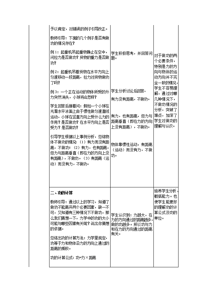【内容简介】一、教学目标1.知道力学中做功的含义。2.能应用公式 进行简单的计算。二、教学重难点教学重点:明确力学中功的含义。教学难点:判断力是否对物体做功。三、教学策略学生已学习了力及力的作用效果等知识,但对于什么是做功还没有直观的认识。本节课从物体对放在地面上的物体及其光滑水平面上拉动的物体的受力分析,引出物理学中功的含义。接着让学生对日常生活常见的具体实例入手让学生分析力作用在物体上后,产生的不同效果,从而理解什么是功。对于“功的计算”公式的得出、应用公式 进行简单的计算均采用演示实验方法,让学生直观观察、思考中使学生总结得出本节所授知识,避免生硬的教学,让学生充分融入到学习中来学习知识。四、教学资源准备多媒体课件等。五、教学过程教学环节教师活动学生活动设计意图导入新课(5分钟)让学生说一说,含有“功”的成语或词语,指出其中“功”的含义。针对学生的回答,教师点评:现代汉语中的“功”主要有成效、成功、贡献的意思,物理学中的“功”吸收了其中“成效”的意思,但它又有特殊的含义,这节课我们一起研究力学的“功”。板书课题:15.1力学中的“功” 学生思考并回答。 将学生的语文知识与物理课堂有机融合。充分调动学生参与课堂教学的积极性。新课教学(30分钟)一、力学中的功1.做功的含义课件展示:(1)叉车把货物举起;(2)小明想把大石头移开,但没有搬起。让学生讨论叉车和小明的工作是否有成效?引导完成物体的受力分析,明确是哪个力对货物的移动做出了贡献,从而初步得出物理学中的功的含义:如果一个力作用在物体上,并且使物体在力的方向上通过一段距离,这个力的作用就有了成效,力学里面就说这个力做了功。2.做功的两个必要因素课件展示:(1)人把物体提到楼上;(2)工人推着车向前运动;(3)小孩子用力推车,车未动;(4)吊车吊着重物静止在空中。让学生标出物体受到力的方向和物体移动的方向,再说出几个事例中哪些是做功的?哪些是不做功的?做功的事例中有哪些相同之处?引导学生总结出力学中做功的两个必要因素:一是作用在物体上的力二是物体在这个力的方向上移动了距离。举例说明在你的周围你发现有哪些做功的例子?比一比,看谁对生活观察得最仔细?学生可能举出很多的例子?如起重机吊起重物、火箭升空、马拉车前进等等。教师对正确的例子予以肯定,对错误的例子引导改正。教师引导:下面的几个例子是否有做功的情况存在?例1:起重机吊起重物静止在空中,问拉力是否做功?货物的重力是否做功?例2:起重机吊着货物在水平方向上匀速移动一段距离,拉力对货物做功了吗?例3:一个正在运动的物体所受的外力突然消失,小球将会怎样?学生回答后接着问:假如一个小球在光滑水平冰面上由于惯性做匀速直线运动,小球在竖直方向上受什么力的作用?是否做功?在水平方向上是否受力?是否做功?引导学生根据以上事例分析,总结物体不做功的情况:(1)有力而没有距离,不做功;(2)有力,也有距离,但力与距离垂直(即在力的方向上没有距离),不做功。(3)有距离(运动)而没有力,不做功。