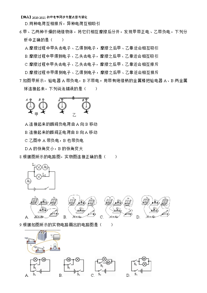 【精品】2020-2021初中电学同步专题点拨与强化:专题01 两种电荷 电流和电路 综合练习(原卷版和解析版)