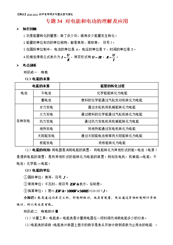 【精品】2020-2021初中电学同步专题点拨与强化:专题34 对电能和电功的理解及应用(原卷版和解析版)