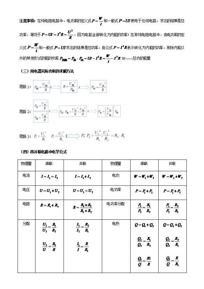 【内容简介】知识点剖析(一)电功率的计算①定义式:电功率等于电功与时间的比值。如果电功用W表示,完成这些电功所用的时间用t表示,电功率用P表示,则 .定义式中各符号的意义及单位如下表所示符 号意 义单 位W电功焦耳(J)t完成这些电功所用的时间秒(s)P电功率瓦特(w)②计算式:根据 与电功的公式 得: .推导式:根据欧姆公式 得: . (二)电功与电功率的区别与联系电功电功率区别意义表示消耗电能的多少表示电流做功的快慢/消耗电能的快慢定义电能转化为其他形式能的过程或电流做功的过程电功与时间之比单位J、kW•hW、kW、mW联系由 的变形式可知 可知,电功由电功率和电流做功的时间来决定注意事项:在纯电阻电路中,电功率的定义式 和一般式 使用于任何电路,求出的结果是总功率,等效于 ,因为电能全部转化为内能的功率;在非纯电阻电路中,由电功率的定义式 和一般式 求出的结果是总功率,由公式 表示转化为内能的功率,而除内能以外的其他形式的能的功率 .W——总功的能量(三)用电器实际功率的求解方法思路1: 思路2: 思路3: (四)串并联电路中电学公式物理量串联并联物理量串联并联电流 电功 电压 电功率 电阻 电功率分配 分配 电热 串联电路: 并联电路: (五)动态电路计算题解题策略关键是分别抓住电路变化前后所处状态,分析电路中的变化量和不变量,运用有关电学规律和电路特点建立状态方程,联立求解。总之,只要掌握正确的解题思路和方法,常见电路的计算问题都能迎刃而解。题型赏析类型1 开关开闭引起的动态电路【例1】如图所示,R1的阻值为10 Ω,S1、S2都闭合时,电压表示数为4.5 V,则电源电压为________V。接着只将S2断开,电压表的示数为3 V,此时R2消耗的电功率为________W。 【答案】4.5 0.45 【解析】当S1、S2都闭合时,R2短路,电路为R1的简单电路,电压表测量电源电压,由此可知,电源电压为4.5 V;当S1闭合、S2断开时,两个电阻串联,电压表测量R1两端电压,即U1=3 V,此时电路中的电流为I=U1R1=3 V10 Ω=0.3 A,R2两端的电压U2=U-U1=4.5 V-3 V=1.5 V,电阻R2消耗的功率为P2=U2I=1.5 V×0.3 A=0.45 W。方法总结:开关开闭引起的电路变化一般有以下三种情况:(1)使某个用电器短路;(2)使两个用电器串联;(3)使两个用电器并联。解题时注意各用电器的连接方式,根据串、并联电路中电流、电压、电阻、电功率的规律进行求解。