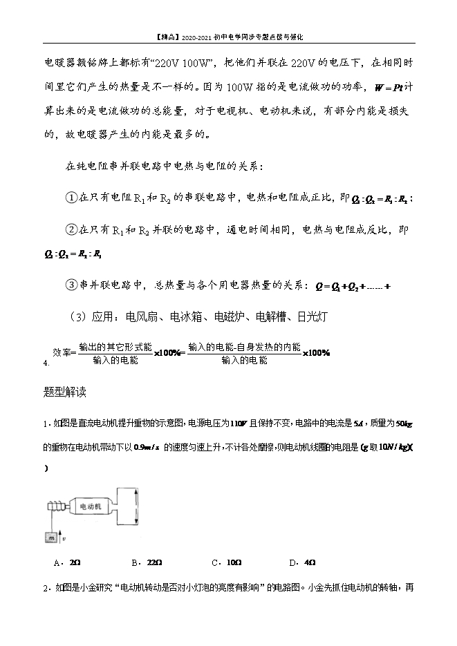 【内容简介】考点解读1.概念:纯电阻电路:电流通过导体做功,全部转化为内能的电路叫做纯电阻电路。非纯电阻电路:电流通过导体,电能转化为内能和其他形式的能的电路叫做非纯电阻电路。2.纯电阻电路焦耳定律(1)能量转化形式:电能全部转化为内能。(2)电能、电功率的计算: 、 (3)应用:白炽灯、电炉、电饭锅、电烙铁、电热毯、电熨斗、转子被卡住的电动机等3.非纯电阻电路焦耳定律:(1)能量转化形式:电能转化机械能和内能。(2)有关电功、电功率计算公式: (计算总能量)、 (计算内能)、 (计算其他形式的能) (计算总功率)、 (计算热功率)、 (计算其他形式能的功率)注意:电动机上的功率表示机械功率,即输出功率 。电视机、电动机、电暖器额铭牌上都标有“220V 100W”,把他们并联在220V的电压下,在相同时间里它们产生的热量是不一样的。因为100W指的是电流做功的功率, 计算出来的是电流做功的总能量,对于电视机、电动机来说,有部分内能是损失的,故电暖器产生的内能是最多的。在纯电阻串并联电路中电热与电阻的关系:①在只有电阻R1和R2的串联电路中,电热和电阻成正比,即 ;②在只有R1和R2并联的电路中,通电时间相同,电热与电阻成反比,即 ③串并联电路中,总热量与各个用电器热量的关系: (3)应用:电风扇、电冰箱、电磁炉、电解槽、日光灯4. 题型解读1.如图是直流电动机提升重物的示意图,电源电压为 且保持不变,电路中的电流是 ,质量为 的重物在电动机带动下以 的速度匀速上升,不计各处摩擦,则电动机线圈的电阻是 取 A. B. C. D. 【解析】电动机克服重力做功的功率: ,电动机的功率: ;,