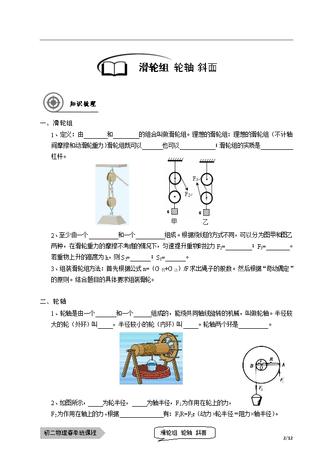 【内容简介】课题滑轮教学目标课题滑轮组 轮轴 斜面(选修)教学目标1.掌握滑轮组的画法2.能够进行简单的滑轮组力学计算3.知道轮轴及其应用4.知道斜面及其应用教学重点1.滑轮组(考试要求C;出题频率低;题型:填空、选择)2.轮轴和斜面(考试要求C;出题频率低;题型:填空、实验)教学安排版块时长1知识梳理25分钟2例题解析30分钟3随堂检测45分钟4课堂总结10分钟5课后作业30分钟6能力提升30分钟一、滑轮组1、定义:由________和_________的组合叫做滑轮组。理想的滑轮组:理想的滑轮组(不计轴间摩擦和动滑轮重力)滑轮组既可以_______也可以____________;滑轮组的实质是___________杠杆。2、至少由一个__________和一个__________组成。根据绕线的方式不同,可以分为图甲和图乙两种,在滑轮重力的摩擦不考虑的情况下,匀速提升重物时拉力F2=_________;F3=________。若重物上升的高度为h,则S2=_______;S3=_______。3、组装滑轮组方法:首先根据公式n=(G物+G动)/F求出绳子的股数。然后根据“奇动偶定”的原则。结合题目的具体要求组装滑轮。二、轮轴1、轮轴是由一个_______和一个______组成的,能绕共同轴线旋转的机械,叫做轮轴。半径较大的轮(外环)叫_____,半径较小的轮(内环)叫_____。轮轴两个环是__________。2、如图所示,_____为轮半径,_____为轴半径,F1为作用在轮上的力,F2为作用在轴上的力,根据_______________有:F1R=F2r(动力×轮半径=阻力×轴半径)。三、斜面1、定义:与_______方向有不为零的夹角的平面叫做斜面。斜面是一种___________,使用斜面的好处是__________,但是要__________。斜面高度一定时,斜面越______,使用它就越________。一、滑轮组知识点一:滑轮组【例1】下列几种说法中正确的是()A.任何一个滑轮组都具备既省力又改变动力方向的优点B.滑轮组的省力情况决定于动滑轮的个数C.滑轮组的省力情况决定于承担物重的绳子段数D.任何滑轮组都具有既省力又省距离的优点【例2】(1)用滑轮组将陷在泥中汽车拉出来,试在图中画出最省力的绕绳方法;(2)请在图中用笔画线代替绳子,将两个滑轮连成滑轮组,要求人力往下拉绳使重物升起。【例6】小张同学用一个距离手3m高的定滑轮拉住重100N的物体,从滑轮正下方沿水平向缓慢移动了4m,如图所示,若不计绳重和摩擦,他用的拉力为_______N,物体上升了_______米。【例7】如图所示装置,用滑轮一物体在水平面上做匀速运动,物体重50N,水平面与物体间的摩擦力为18N,(不考虑其他摩擦)则F1=_____N。