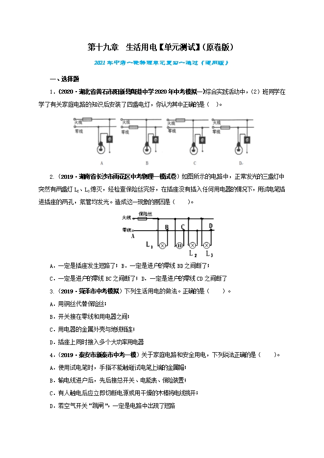 第十九章 生活用电--2021年中考物理第一轮单元复习一遍过(综合备课+真题训练+单元测试)