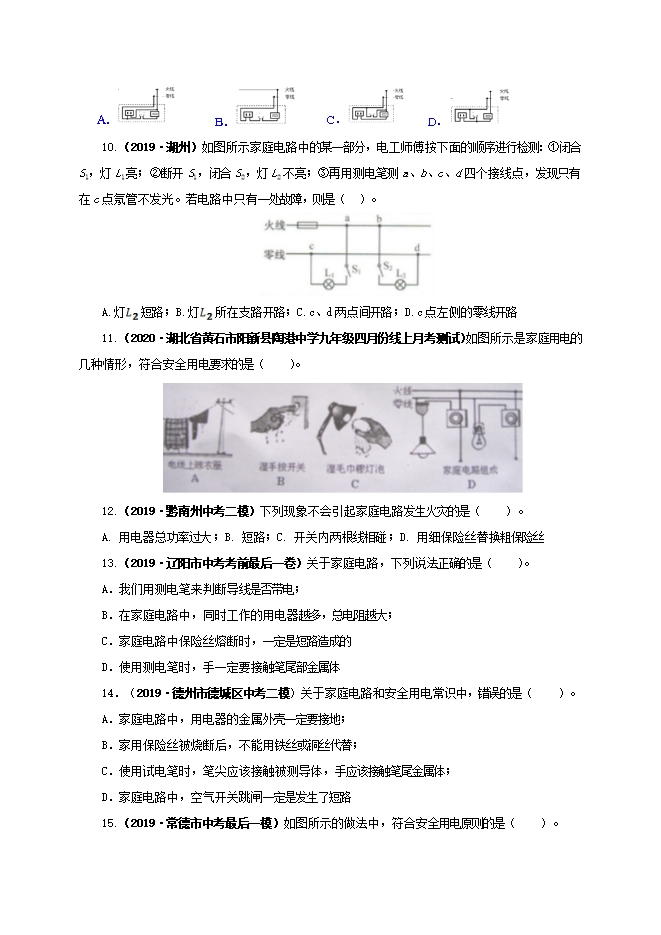 - 4462024-2025人教版九年级物理《第十九章 生活用电》同步拓展提升试题及解析
