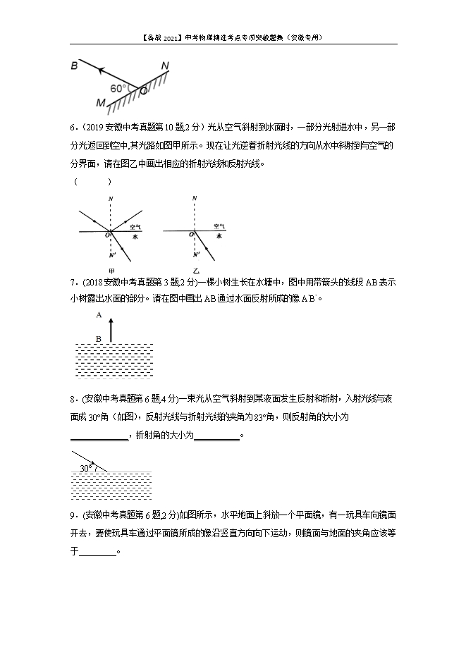 【内容简介】考点一 光现象的辨析1.(安徽中考真题第2题,3分)生活中一些光现象:①阳光下树的影子;②水面波光粼粼;③交警身上穿的警用背心在灯光照射下很亮;④站在岸边能看到水里的鱼。其中能用光的反射解释的 (填序号)。2.(2020安徽省黄山市初三三模)清澈平静的湖面上空,一只小燕子正向下俯冲捕食,下列说法正确的是:A.小燕子在湖水中的像是由光的反射形成的B.小燕子在湖水中的像是由光的折射形成的C.俯冲过程中,小燕子在湖水中的像越来越大D.俯冲过程中,小燕子在湖水中的像越来越小3.(2020安徽省蚌埠市禹会区一模)如图,春节放烟花是我国的传统习俗,缤纷的烟花能将节日氛围烘托的更加浓厚,下列分析正确的是( ) A.我们能够看到璀璨的烟花,是由于光的直线传播B.水面上的烟花倒影是光的反射形成的倒立的实像C.平静的水面映出的烟花影像,是因为光在水和空气的界面上发生折射D.摄影师利用胶片相机拍摄烟花,底片上是烟花正立的缩小的实像4.(2020安徽芜湖初三三模)下列现象中,能用光的直线传播解释的是 A.树荫下圆形光斑 B.海市蜃楼 C.露珠下的叶脉 D.水中“倒影”考点二 光现象作图及角度计算5. (2020安徽中考真题第3题,2分)图中MN为平面镜,OB为入射光线AO的反射光线。请在图中画出光线AO并标出入射角的度数。 6.(2019安徽中考真题第10题,2分)光从空气斜射到水面时,一部分光射进水中,另一部分光返回到空中,其光路如图甲所示。现在让光逆着折射光线的方向从水中斜射到与空气的分界面,请在图乙中画出相应的折射光线和反射光线。( ) 7.(2018安徽中考真题第3题,2分)一棵小树生长在水塘中,图中用带箭头的线段AB表示小树露出水面的部分。请在图中画出AB通过水面反射所成的像A’B’。 8.(安徽中考真题第6题,4分)一束光从空气斜射到某液面发生反射和折射,入射光线与液面成30°角(如图),反射光线与折射光线的夹角为83°角,则反射角的大小为______________,折射角的大小为___________。 9.(安徽中考真题第6题,2分)如图所示,水平地面上斜放一个平面镜,有一玩具车向镜面开去,要使玩具车通过平面镜所成的像沿竖直方向向下运动,则镜面与地面的夹角应该等于 。 10.(2020安徽蚌埠市怀远初三二模)从岸边看水中的鱼,看到的“鱼”的位置与实际位置不同.下列模型能解释此现象的是A. B. C. D. 11.(2020安徽省宣城市初三模拟测试三)当光从空气斜射入水中时,在水面发生折射,如图所示,请你画出大致的折射光线。