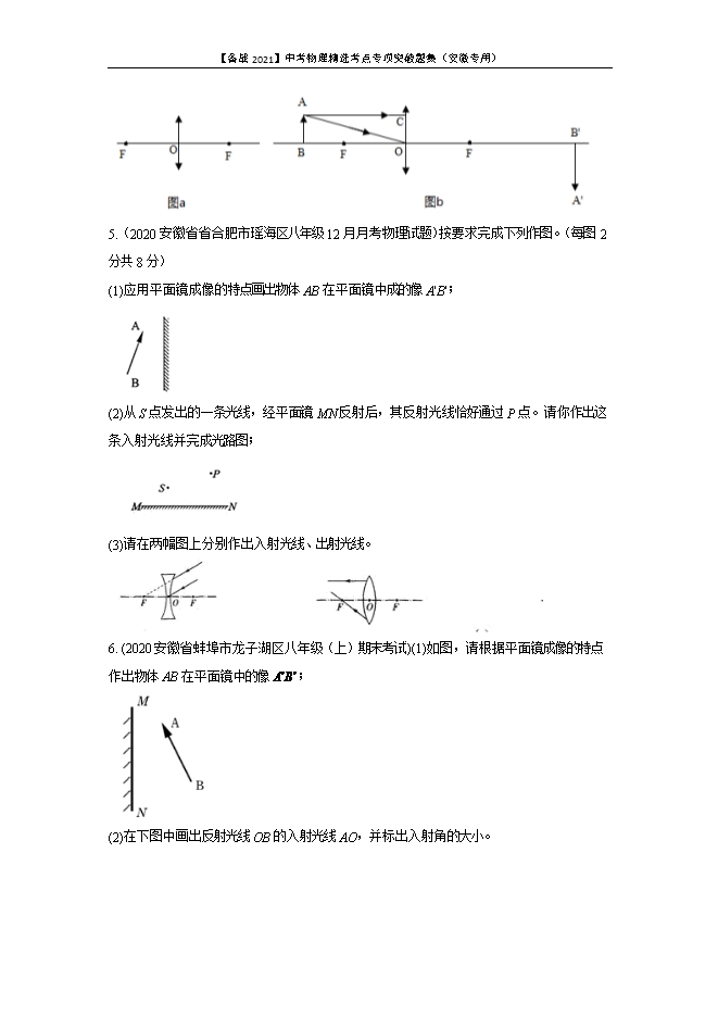 【内容简介】考点一 透镜成像规律作图1.(安徽中考真题第7题,2分)图中L为凸透镜,MN为其主光轴,D为光心,若物体AB经凸透镜成的实像为A'B’,试用作图的方法确定凸透镜的一个焦点F,并在图中标出F的位置。 2.(安徽中考真题第10题,2分)如图,L表示凹透镜,MN为主光轴,O点为光心。图甲和图乙表示经过凹透镜的两条特殊光路,请请运用凹透镜的特殊光路,在图丙中画出物体AB通过凹透镜所成虚像A'B'的光路图。 3.(2018安徽中考真题第12题,3分)下列光路图错误的是( ) A. 放大镜成像 B. 小孔成像 C. 光由空气斜射到水面 D. 近视眼的矫正4.(2020安徽省安庆市岳西县八年级(上)期末考试)凸透镜的成像规律可以通过画光路图去理解。在光路图中凸透镜用图a表示,O点为光心,F为焦点。图b中A'B'是物体AB经透镜所成的像。请画出图b中两条入射光线的出射光线,完成成像光路图。 5.(2020安徽省省合肥市瑶海区八年级12月月考物理试题)按要求完成下列作图。(每图2分共8分)(1)应用平面镜成像的特点画出物体AB在平面镜中成的像A'B'; (2)从S点发出的一条光线,经平面镜MN反射后,其反射光线恰好通过P点。请你作出这条入射光线并完成光路图; (3)请在两幅图上分别作出入射光线、出射光线。 6. (2020安徽省蚌埠市龙子湖区八年级(上)期末考试)(1)如图,请根据平面镜成像的特点作出物体AB在平面镜中的像 ; (2)在下图中画出反射光线OB的入射光线AO,并标出入射角的大小。 (3)在图中,完成光线从左边射向凸透镜折射后,再射向凹透镜折射后的光路。 7.(2020安徽省滁州市八年级(上)期末考试)如图所示,MN为凸透镜的主光轴,A为蜡烛,A′为蜡烛在光屏上所成的像,根据凸透镜成像原理确定凸透镜的位置,并将凸透镜画出来。 8.(2020安徽省界首市八年级(上)期末)凸透镜成像规律可以通过画光路图去理解。在光路图中凸透镜用图甲表示,O点为光心,F为其焦点。图乙是运用经过凸透镜的两条特殊光线,所画物体AB 经凸透镜成的像A'B'的光路图。请参照图乙,在图丙中适当位置画上凸透镜,并标出其焦点(一个即可)的位置(其中AB是置于主光轴之物体,MN是AB的像)。 9.(2020安徽省宿州市三模)如图,由水中射出一束光 ab 照射到凹透镜上,该光束与凹透镜的主光轴平行(F 为凹透镜的焦点,O 为光心)。请画出 ab 光束在水中的入射光和通过凹透镜后的折射光。 10.(2020安徽蚌埠市五河初三一模)如图所示,一条光线入射到凹透镜后,再折射到水中,画出该条光线照射到凹透镜的入射光线及在水中传播的大致光路。 考点二 凸透镜成像规律及应用11.(安徽中考真题第13题,3分)人们根据物理原理或规律制造出许多机器设备,下列叙述中正确的是( )A.投影仪是利用凸透镜成像的原理B.电动机是利用电磁感应现象制成的C.内燃机是将机械能转化为内能的机器 D.发电机的原理是磁场对电流有力的作用 12.(2020安徽中考真题第14题,2分)图a是放置在水平桌面上的刻度尺的一部分,甲、乙、丙、丁是通过凸透镜所看到的刻度尺的像。若凸透镜先贴着刻度尺然后逐渐远离,则看到刻度尺的像的先后顺序正确的是( )