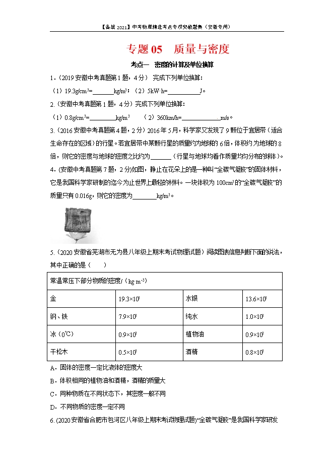 专题05 质量与密度--【备战2021】中考物理精选考点专项突破题集(安徽专用)