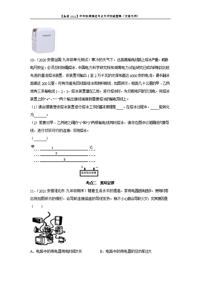 【内容简介】考点一 电流的热效应1.(2020•安徽宣城市•)在九年级复习的过程中,小聪同学对物理知识点做了如下总结,其中正确的是( )A. 图中小球摆动过程中,小球受重力和绳子的拉力对小球做了功B. 图中墨水在热水中扩散得快,说明温度越高,分子无规则运动越剧烈C. 图中小球c带正电,则b球一定带正电,a球一定带负电D. 图中电暖器,若用超导体替代电热丝效果会更好2.(2020•安徽芜湖市•九年级期末)下列说法不正确的是( )A.火箭用液态氢做燃料主要是氢气的热值大B.功率大的机械比功率小的机械做功一定快C.物体的内能增加,一定是从外界吸收热量D.电视机后盖的散热窗是防止电流的热效应造成的危害3.(2020•安徽九年级其他模拟)下列用电器中,利用电流热效应工作的是A.计算器B.电热水壶C.收音机D.电冰箱4.(2020•安徽全国•九年级单元测试)当温度降低到一定程度时,某些物质的电阻会变为零,这种现象叫超导.常温下超导体的应用有着十分诱人的前景.下面的几个电路元件可用超导体制作的是A.电阻箱的电阻丝B.电动机的线圈C.电炉的电热丝D.白炽灯泡的灯丝5.(2020•安徽安庆市•九年级期末)一台“220V 60W”的电扇,一个“220V 60W”的白炽灯,一个“220V 60W”的电烙铁,将它们并联接在220V的电压下,在相同的时间内,比较它们产生的热量,则( )A.白炽灯最多B.电烙铁最多C.电扇最多D.都一样多6.(2020•安徽九年级一模)石墨烯是一种高分子构成的片状结构材料,这种材料在一定条件下电阻可以降为零,它是由我国少年科学家曹原发现的,这一特点可以在生活中用于_____________(选填“电饭锅发热丝”、“电动机线圈”或“小灯泡的灯丝”)。7.(2020•安徽宣城市•九年级期末)如图所示,将长短和粗细相同、材料不同的金属丝分别接入电路,当把铜丝接入电路后,闭合开关,小灯泡发光较亮。现生活中,若想制作电阻加热元件,根据你的分析应选择________材料较好。(选填“铜丝”或“镍铬合金丝”) 8.(2020•安徽合肥市•九年级期末)甲、乙两只电炉标有“220V 500W”和“220V 1000W”字样,把它们串联在 220V 的电路中,在相同时间内产生热量较多的是_____(选填“甲”或“乙”)电炉:它们串联时甲电炉消耗的电功率与它们并联在 220V 的电路中时甲电炉消耗的电功率之比为_____。9.(2020•安徽全国•九年级单元测试)如图所示为“iPad”的充电器,参数标有5V 2.1A,表示充电电压是5V,最大输出电流2.1A,电板充满电所储存的电能是113400J.若“iPad”充电时以最大输出电流充电,要将空电板充满电需要_____小时,小明觉得充电时间太长了,他想为什么苹果公司在设计时不把最大输出电流提高呢?这样可以实现快速充电,于是他请教了科学老师,老师告诉了他一个信息,影响锂电池寿命的最大杀手是电板发热,小明恍然大悟,请你解释其中的原因_____。 10.(2020•安徽全国•九年级单元测试)寒冷的天气下,远距离输电线路上结冰严重,威胁电网安全,必须及时除霜熔冰.中国电力科学研究院和湖南电力试验研究已成功研制出比较先进的直流熔冰装置.该装置可输出1至2万千瓦的功率和高达6000安的电流,最长融冰距离近200公里,可有效避免因线路结冰而倒杆断线.如图所示,相距几十公里的甲、乙两地有三条输电线1、2、3,熔冰装置建在乙地,进行熔冰时,先切断电网的交流电,将熔冰装置上的“+”、“﹣”两个输出接线端接到需要熔冰的输电导线上。