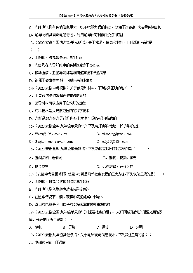 专题30 信息的传递--【备战2021】中考物理精选考点专项突破题集(安徽专用)