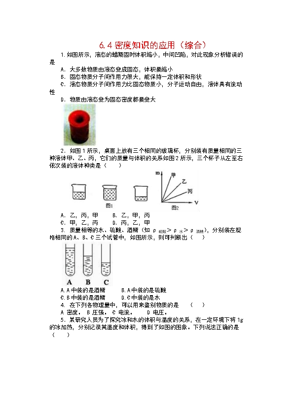【内容简介】1.如图所示,液态的蜡凝固时体积缩小,中间凹陷,对此现象分析错误的是 A.大多数物质由液态变成固态,体积要缩小 B.固态物质分子间作用力很大,能保持一定体积和形状 C.液态物质分子间作用力比固态物质小,分子运动自由,液体具有流动性 D.物质由液态变为固态密度都要变大 2.如图1所示,桌面上放有三个相同的玻璃杯,分别装有质量相同的三种液体甲、乙、丙,它们的质量与体积的关系如图2所示,三个杯子从左至右依次装的液体种类是( ) A.乙,丙,甲B.乙,甲,丙C.甲,乙,丙D.丙,乙,甲 3. 质量相等的水、硫酸、酒精(知ρ硫酸>ρ水>ρ酒精),分别装在规格相同的A、B、C三个试管中,如图所示,则可判断出( ) A.A中装的是酒精 B.A中装的是硫酸 C.B中装的是酒精 D.C中装的是水 4. 在下列各物理量中,可以用来鉴别物质的是 ( )A 密度。 B 压强。 C 电流。 D 电压。 5.某研究人员为了探究冰和水的体积与温度的关系,在一定环境下将1g的冰加热,分别记录其温度和体积,得到了如图的图象。下列说法正确的是( ) A.同种物质的密度与状态无关B.同种物质相同状态下的密度与温度无关C.水温升高时,水的密度先减小后增大D.4℃时,1dm3纯水的质量为1kg 6.很多同学知道自己的身高和体重,却不知道自己的体积,某同学身高160cm,体重50kg,他的体积约为( )A.5m3B.0.5m3C.0.05m3D.0.005m3 7.武打故事影片中常有这样的镜头:“高墙”倒塌压在众人(演员)身上,造成人员受伤。但在实际拍摄中,倒塌的高墙并不会伤害演员,砌成这种高墙的物块最有可能是( )A.泥土砖块 B.金属块 C.泡沫塑料块 D.水泥砖块 8. 水银的密度为13.6×lO 3 kg/m 3 ,它表示的意思是( ) A.1m 3 水银的密度是13.6×10 3 kgB.1m 3 水银的质量是13.6×10 3 kg/m 3 C.1m 3 水银的质量是13.6×10 3 kg D.1kg水银的体积是13.6×10 3 m 3 9.甲和乙的密度之比为3:1,质量之比1:4,则它们的体积之比为( )A.3:4B.1:12C.4:3D.12:1 10.下列的说法属于正确的是( )A.应该选用体积大的材料制造机器底座 B.应该选用坚硬的材料制造飞机C.应该选用质量大的材料制造飞机 D.应该选用密度小的材料制造飞机