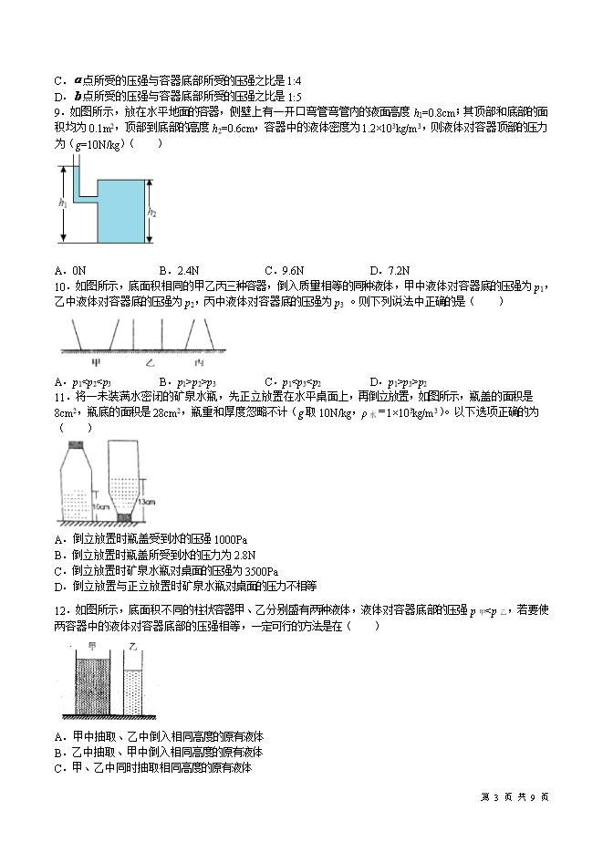 【内容简介】1.如图所示,平底水桶底面积为5×10-2m2,桶高50cm,空桶的质量为1kg。桶内装有40cm深的水,水桶放在水平地面上,水对桶底的压力比桶对地面的压力小40N。g取10N/kg。下列选项中正确的是( ) A.水对桶底的压强是5000PaB.水对桶底的压力250NC.桶对地面的压力是160ND.桶内水的质量23kg【答案】D【解析】A.水对桶底的压强 故A错误;B.水对桶的压力 故B错误;C.因为水对桶底的压力比桶对地面的压力小40N,所以桶对地面的压力 故C错误;D.桶对地面的压力还可表示为 桶中水的重力 水的质量 故D正确。故选D。2.对于公式p=F/S和p=ρgh的适用范围,下列说法正确的是A.p=F/S只适用于固体压强的计算B.p=F/S只适用于柱形液体压强的计算C.p=F/S适用于固体和液体压强的求解,p=ρgh只适用于液体压强的求解D.关于液体压强的求解,p=F/S和p=ρgh均可使用,但由于ρ和h容易直接测得,所以通常运用p=ρgh求解【答案】D【解析】【分析】区分压强的定义式p= 和液体压强的公式p=ρgh,得出答案。【解析】物体单位面积上受到的压力叫压强,公式p= ,适用于固体、液体和气体;公式p=ρgh一般适用于液体,对于密度均匀的柱状固体也可以适用。故选:D。3.如图所示,在水平桌面上的甲、乙两个完全相同的烧杯中,分别装有质量相等的两种液体。液体中的A、B两点在同一条水平线上。 比较液体在这两点产生压强的大小,正确的是( ) A.pA<pBB.pA>pBC.pA=pBD.无法判断【答案】A【解析】因为甲乙烧杯内液体质量相等,所以两个烧杯底部所受压强相同,都为p,乙内液体的体积大,所以乙的密度小,根据公式p=ρgh可知,A、B以下液体对烧杯底部的压强