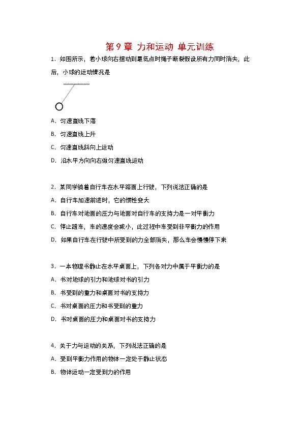 【内容简介】1.如图所示,若小球向右摆动到最低点时绳子断裂假设所有力同时消失,此后,小球的运动情况是 A.匀速直线下落B.匀速直线上升C.匀速直线斜向上运动D.沿水平方向向右做匀速直线运动 2.某同学骑着自行车在水平路面上行驶,下列说法正确的是A.自行车加速前进时,它的惯性变大B.自行车对地面的压力与地面对自行车的支持力是一对平衡力C.停止蹬车,车的速度会减小,此过程中车受到非平衡力的作用D.如果自行车在行驶中所受到的力全部消失,那么车会慢慢停下来 3.一本物理书静止在水平桌面上,下列各对力中属于平衡力的是A.书对地球的引力和地球对书的引力B.书受到的重力和桌面对书的支持力C.书对桌面的压力和书受到的重力D.书对桌面的压力和桌面对书的支持力 4.关于力与运动的关系,下列说法正确的是A.受到平衡力作用的物体一定处于静止状态B.物体运动一定受到力的作用C.在太空中的宇航员没有惯性D.在粗糙水平面上静止的物体不受摩擦力 5.如图是某学生在运动场上看到的一些场景,他运用学过的物理知识进行分析,下列分析正确的是 A.王浩同学踢出去的足球在草地上滚动时慢慢停下来,是因为足球受到摩擦力的作用B.张红同学百米冲线后没有立即停下来,是因为受到惯性的作用C.张彦同学在做引体向上,当他在单杠上静止不动时,他对单杠的拉力和他的重力是一对平衡力D.李宁同学正在跳高,当他腾跃到最高点时,不受重力的作用 6.同学们骑自行车减速进入车棚的过程中,自行车的惯性A.一直不变B.一直变小C.先变小后不变D.先不变后变大 7.上体育课时,涵涵同学看到操场上的物理现象,其中解释不正确的是( )A.地面上滚动的足球越滚越慢,是由于足球的惯性越来越小B.跳远的同学在起跳时用力蹬地是因为力的作用是相互的C.球拍击打羽毛球,改变羽毛球的运动方向,说明力能改变物体的运动状态D.穿运动鞋跑步不易滑倒是利用运动鞋底部凹凸不平的花纹来增大摩擦