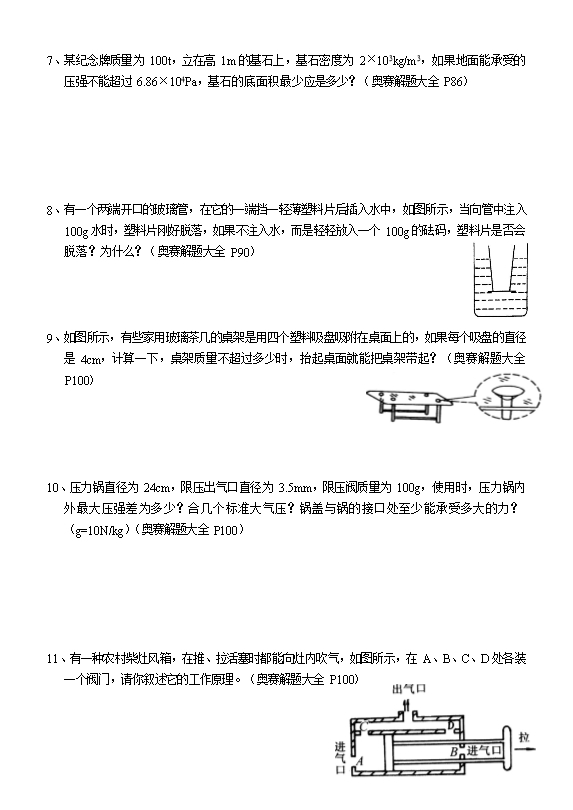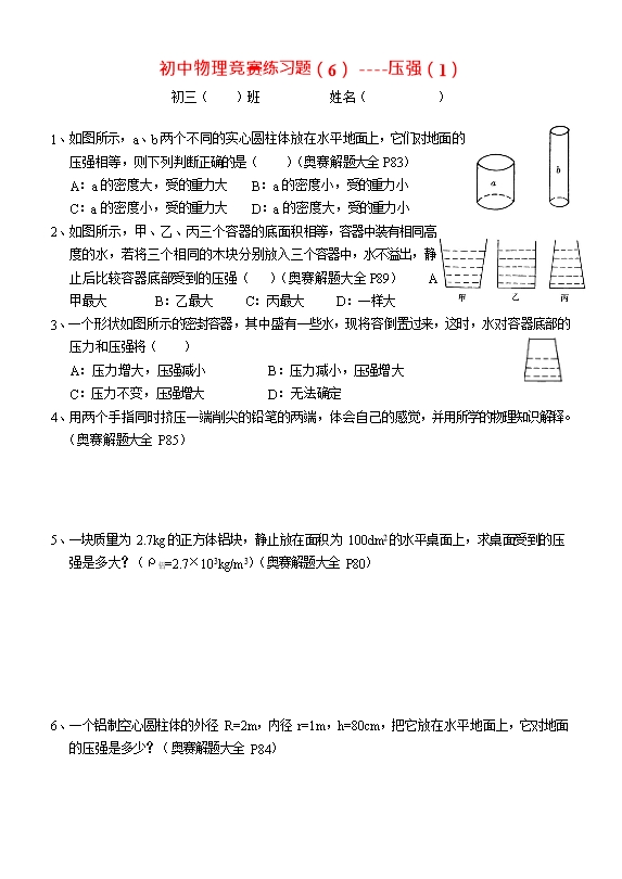 【内容简介】1、如图所示,a、b 两个不同的实心圆柱体放在水平地面上,它们对地面的压强相等,则下列判断正确的是()(奥赛解题大全 P83)A:a 的密度大,受的重力大B:a 的密度小,受的重力小C:a 的密度小,受的重力大D:a 的密度大,受的重力小2、如图所示,甲、乙、丙三个容器的底面积相等,容器中装有相同高度的水,若将三个相同的木块分别放入三个容器中,水不溢出,静止后比较容器底部受到的压强()(奥赛解题大全 P89) A:甲最大B:乙最大C:丙最大D:一样大3、一个形状如图所示的密封容器,其中盛有一些水,现将容倒置过来,这时,水对容器底部的压力和压强将()A:压力增大,压强减小B:压力减小,压强增大C:压力不变,压强增大D:无法确定4、用两个手指同时挤压一端削尖的铅笔的两端,体会自己的感觉,并用所学的物理知识解释。(奥赛解题大全 P85)5、一块质量为 2.7kg 的正方体铝块,静止放在面积为 100dm2 的水平桌面上,求桌面受到的压强是多大?(ρ铝=2.7×103kg/m3)(奥赛解题大全 P80)6、一个铝制空心圆柱体的外径 R=2m,内径 r=1m,h=80cm,把它放在水平地面上,它对地面的压强是多少?(奥赛解题大全 P84) 7、某纪念牌质量为 100t,立在高 1m 的基石上,基石密度为 2×103kg/m3,如果地面能承受的压强不能超过 6.86×104Pa,基石的底面积最少应是多少?(奥赛解题大全 P86)8、有一个两端开口的玻璃管,在它的一端挡一轻薄塑料片后插入水中,如图所示,当向管中注入 100g 水时,塑料片刚好脱落,如果不注入水,而是轻轻放入一个 100g 的砝码,塑料片是否会脱落?为什么?(奥赛解题大全 P90)