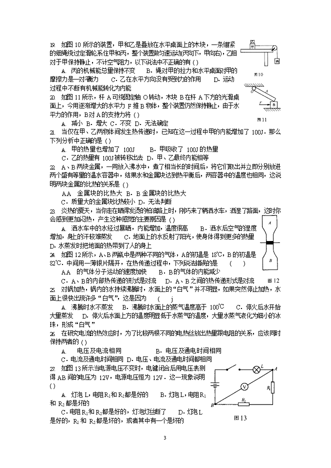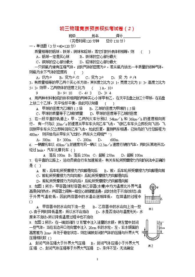【内容简介】一、单选题(3 分 40=120 分)1.质量相等的铝球、铁球、铜球和铅球,若它们的外表体积相等,则() A.铝球一定是实心球B.铁球的空心部分最大 C.铜球的空心部分最大D.铅球的空心部分最大2.一只钢瓶内储有压缩气体,此时气体的密度为ρ,若从瓶内放出一半质量的该种气体, 则瓶内余下气体的密度将()A.仍为ρB.变为ρ/2C.变为 2ρD. 变 为 ρ/4 3.有质量相等的甲乙两个实心长方体,其长度之比为 2:1,宽度之比为 1:3,高度之比为5:3,则甲、乙两物体的密度之比为() A.10:9B,9:10C.4:3D.3:44.用两种材料制成的体积相同的两种实心小球甲和乙.在天平左盘上放三个甲球,在右盘上放二个乙球,天平恰好平衡,由此可以知道()A.甲球的密度为乙球的 1.5 倍B.乙球的密度为甲球的 1.5 倍C.甲球的质量等于乙球的质量D.甲球的密度等于乙球的密度5.在一段平直的轨道上,甲、乙两列火车分别以 54km/h 和 36km/h 的速度相向而行. 有一只鸟以 20m/s 的速度从甲车车头向乙车飞去,飞到乙车车头立即反向飞回,飞回到甲车车头又立即转回向乙车飞去,如此反复,直到两车相遇.已知鸟的飞行总路程为 400m, 则开始鸟从甲车头飞出时,两车头之间相距 ( )A.500mB,300mC.200mD. 600m6.一辆摩托车以 60km/h 的速度与另一辆以 12.5m/s 速度行驶的汽车,同时从某地开出, 经过 lmin,汽车比摩托车 ( )A.落后 100mB.落后 250mC.超前 250mD.超前 100m7.在平直的公路上,运动员骑自行车加速前进,有关车轮所受摩擦力方向的说法中正确的是()A.前、后车轮所受摩擦力方向都是向后B.前,后车轮所受摩擦力方向都是向前C.前轮所受摩擦力方向向前;后轮所受摩擦力方向都是向后 D.前轮所受摩擦力方向向后;后轮所受摩擦力方向都是向前8.如图 1 所示,甲容器(球形容器)和乙容器(水槽)中均为温度比外界气温高得多的热水,两容器之间有一细空心玻璃管连通,此时水处于不流动状态. 由于外界气温较低,因此两容器中的水温会逐渐降低, 在降温的过程中 ( )A.甲容器中的水会向下流一些B.乙容器中的水会向上流一些C.由于同时降低温度,所以水不会流动D.水是否流动与温度无关,水原来不流动,所以降低温度过程中也不流动9.如图 2 所示,在一端封闭的 U 形管中注入适量的水银,使左管中封闭一些气体,当在右边开口处向管中注入 20cm 长的水柱,左、右水银面的高度差为 2cm,并处于稳定状态.则左端被封闭的气体的压强与外界大气压强相比较 ( )A.封闭气体压强大于外界大气压强 B.封闭气体压强小于外界大气压强 C.封闭气体压强等于外界大气压强 D.条件不足,无法确定 10.有一两端开口为 lm 长的玻璃管,在它的一端包一层橡皮膜,灌满水后,用手指堵住开口端插入水槽中如图 3 所示.手放开后,橡皮的形状()A.平的B.凸出来C.凹进去D.无法确定11.如图 4 所示,甲、乙两个容器,由一个细管相通,细管中间有一开关 K,先把开关 K 关上,在两个容器中装有不同量的水,甲中水面比乙中水面高,然后将甲容器的上口用盖子密封好,再打开开关 K,下列判断正确的是()A.甲中的水能往乙中流,直到乙中的水面比甲中的水面高出一些为止B.甲中的水不能往乙中流,水面的原来的高度不变C.甲中的水能往乙中流,直到两容器中的水面流平为止D.甲中的水能往乙中流,但甲中的水面一定比乙要高一些12.如图 5 所示,容器内盛有 h 高的水,水面上有一横截面积为 S 重力和摩擦阻力不计的活塞 A,活塞上放一重力为 G、底面积为 S/的物块,则容器底受到的压强为 ( )A.ρgh B.G+ρgh C.ρgh+G/S/D.G/S+ρgh 13.将质量相等的一个空心铁球和一个实心铁球放入足够深的水中,则 ( )A.空心铁球受的浮力大些 B.实心铁球受的浮力大些C.两个铁球受的浮力一样大 D.无法比较两个铁球所受的浮力大小14.把一个小球轻轻放入盛满水的杯子中,溢出了 0.1kg 水,则小球的质量 ( ) A.一定等于 0.1kg B.小于或等于 0.1kgC.一定大于 0.1kg D.大于或等于 0.1kg