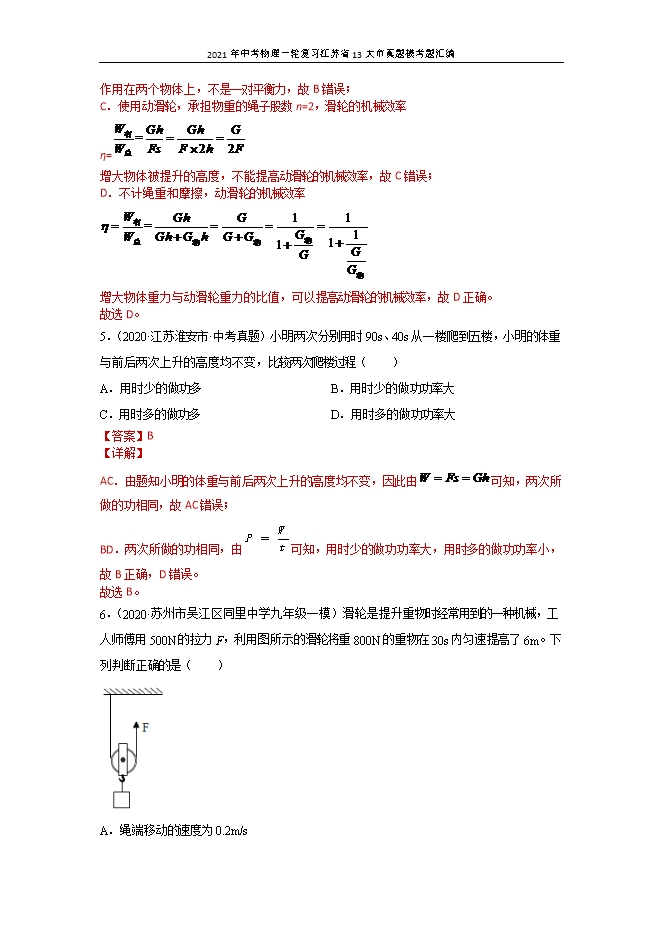 【内容简介】1.(2020•江苏苏州市•中考真题)如图所示的工具中,在使用时属于省力杠杆的是( )A. 镊子B. 开瓶器C. 船桨D. 钓鱼竿【答案】B【详解】镊子、船桨、钓鱼竿在使用时,动力臂小于阻力臂,为费力杠杆;开瓶器在使用时,动力臂大于阻力臂,为省力杠杆,故B符合题意。故选B。2.(2020•江苏南通市•中考真题)如图,裤架上的两个夹子分别夹住一条毛巾。以下方法能使裤架在水平位置平衡的是 A.右边夹子向左移动B.左边夹子向左移动C.右边毛巾的下角夹在左边夹子上D.左边毛中的下角夹在右边夹子上【答案】D【详解】AB.由图可知,裤架左低右高,说明左端较重,所以应将左边或右边的夹子向右移动,故AB项不符合题意;C.右边毛巾的下角夹在左边夹子上,相当于给左端增加重物,右端减小重物,使左端更重,故C项不符合题意;D.左边毛中的下角夹在右边夹子上,相当于给左端减小重物,右端减小重物,使左端变轻,裤架在水平位置平衡,故D项符合题意。故选D。3.(2020•江苏盐城市•中考真题)如图所示,小明利用动滑轮匀速提升木箱。以下做法可以提高动滑轮机械效率的是( ) A.适当增加木箱重力B.增大木箱上升高度C.增大提升木箱的速度D.换用质量更大的动滑轮【答案】A【详解】A.额外功不变,如果增加木箱重力,有用功会增大,有用功在总功中所占的比例将增大,机械效率会增大,故A符合题意;BC.动滑轮机械效率的高低与木箱上升的高度和上升的速度无关,故BC不符合题意;D.换用质量更大的动滑轮,额外功增加,有用功在总功中所占的比例将减小,机械效率降低,故D不符合题意。故选A。4.(2020•江苏宿迁市•中考真题)小华用图装置测量动滑轮的机械效率,下列说法正确的是( ) A.实验中为测量方便,让弹簧测力计在静止时读数B.弹簧测力计对绳子的拉力与物体的重力是一对平衡力C.增大物体被提升的高度,可以提高动滑轮的机械效率D.增大物体重力与动滑轮重力的比值,可以提高动滑轮的机械效率(不计绳重和摩擦)【答案】D【详解】A.测量动滑轮的机械效率,需要匀速拉动弹簧测力计,不能在弹簧测力计静止时读数,故A错误;B.弹簧测力计对绳子的拉力,作用在绳子上;物体的重力,作用在提升的物体上,即二力作用在两个物体上,不是一对平衡力,故B错误;C.使用动滑轮,承担物重的绳子股数n=2,滑轮的机械效率η= 增大物体被提升的高度,不能提高动滑轮的机械效率,故C错误;D.不计绳重和摩擦,动滑轮的机械效率 增大物体重力与动滑轮重力的比值,可以提高动滑轮的机械效率,故D正确。故选D。5.(2020•江苏淮安市•中考真题)小明两次分别用时90s、40s从一楼爬到五楼,小明的体重与前后两次上升的高度均不变,比较两次爬楼过程( )A.用时少的做功多B.用时少的做功功率大C.用时多的做功多D.用时多的做功功率大【答案】B【详解】AC.由题知小明的体重与前后两次上升的高度均不变,因此由 可知,两次所做的功相同,故AC错误;BD.两次所做的功相同,由 可知,用时少的做功功率大,用时多的做功功率小,故B正确,D错误。故选B。6.(2020•苏州市吴江区同里中学九年级一模)滑轮是提升重物时经常用到的一种机械,工人师傅用500N的拉力F,利用图所示的滑轮将重800N的重物在30s内匀速提高了6m。下列判断正确的是( ) A.绳端移动的速度为0.2m/sB.该滑轮的机械效率为62.5%C.工人师傅拉绳子的功率为200WD.提升重物所做的有用功为3000J【答案】C【详解】A.由图可知,绳子承担重物的段数n为2,则绳子自由端被拉上的距离s=nh=2×6m=12m绳端移动的速度 故A错误;BCD.拉力F做的功W总=Fs=500N×12m=6000J拉力F的功率 有用功W有=Gh=800N×6m=4800J滑轮组的机械效率 故BD错误,C正确。故选C。7.(2020•江苏扬州市•九年级二模)如图甲,静止在水平面上的物块,受水平拉力F作用,F随时间t的变化关系如图乙所示。从t=0开始,小兵每隔2s记录的物块位置和时刻如图丙所示,下列说法正确的是( )