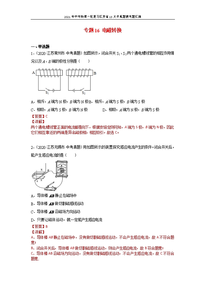【内容简介】1.(2020•江苏常州市•中考真题)如图所示,闭合开关S1、S2两个通电螺线管的相互作用情况以及A、B端的极性分别是( ) A.相斥,A端为N极,B端为N极B.相斥,A端为S极,B端为S极C.相吸,A端为S极,B端为N极D.相吸,A端为N极,B端为S极【答案】C【详解】两个通电螺线管正面的电流都是向下,根据安培定则可知,A端为S极,B端为N极,因此它们相互靠近的两端是异名磁极相,相互吸引。故选C。2.(2020•江苏无锡市•中考真题)用如图所示的装置探究感应电流产生的条件。闭合开关后,能产生感应电流的是( ) A.导体棒 静止在磁场中B.导体棒 做切割磁感线运动C.导体棒 沿磁场方向运动D.只要让磁体运动,就一定能产生感应电流【答案】B【详解】A.导体棒AB静止在磁场中,没有做切割磁感线运动,不会产生感应电流,故A不符合题意;B.闭合开关后,导体棒AB做切割磁感线运动,则会产生感应电流,故B符合题意;C.导体棒AB沿磁场方向运动,没有做切割磁感线运动,不会产生感应电流,故C不符合题意;D.若磁体沿竖直方向运动时,此时导体相对于磁体没有做切割磁感线运动,不会产生感应电流,故D不符合题意。故选B。3.(2020•江苏镇江市•中考真题)如图所示,蹄形磁铁和铜棒均水平放置。现闭合开关,水平向左移动铜棒,电流表G的指针发生偏转,则 A.根据此现象的产生原理可制成电动机B.此现象与奥斯特实验现象的产生原理相同C.若将铜棒左右来回移动,可产生交变电流D.仅将磁铁水平向右移动,G的指针不偏转【答案】C【详解】由图可知,是探究感应电流产生条件的实验装置:A.根据电磁感应现象的产生原理可制成发电机,故A不符合题意;B.奥斯特实验表明通电导线周围和永磁体周围一样都存在磁场,而电磁感应现象是指闭合电路的一部分导体在磁场中作切割磁感线运动,导体中就会产生电流的现象,二者产生的原理不同,故B不符合题意;C.将铜棒左右来回移动,导体切割磁感线运动,感应电流大小和方向不断变化,可产生交变电流,故C符合题意;D.将磁铁水平向右移动,导体切割磁感线运动,可产生交变电流,G的指针偏转,故D不符合题意。故选C。4.(2020•江苏南京市•中考真题)如图是一台正在工作的电扇。下图四个实验能反映其工作原理的是( ) A. B. C. D. 【答案】C【详解】电风扇的工作原理是通电导线在磁场中受力运动。A.该实验是奥斯特实验,说明通电导体周围存在磁场,是电流的磁效应,故A不符合题意;B.该实验中,闭合开关,拨动风扇,小灯泡会发光,说明闭合电路中的一部分导体在磁场中做切割磁感线运动时,会产生感应电流,是机械能转化为电能,故B不符合题意;C.该实验中,当给导体中通电时,通电导体在磁场中受力的作用而运动,与电扇的工作原理相同,故C符合题意;D.该实验是探究影响电磁铁磁性大小因素的实验,利用的电流的磁效应,故D不符合题意。故选C。
