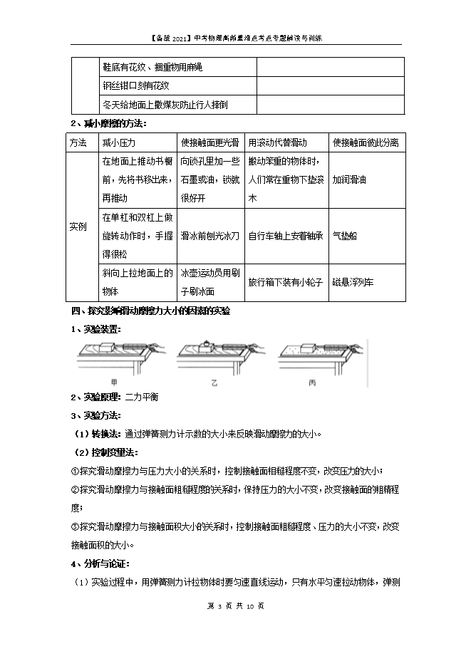 【内容简介】由于摩擦力有三种,不同摩擦力的大小确定方法不同以及摩擦的有无、方向问题使得学生在在学习过程中常常感到有困难的一个知识点,同时也是中考中常考的一个知识点。本专题侧重这些知识点的突破,希望有助于学好摩擦力。 一、摩擦力的产生种类定义方向产生条件滑动摩擦力当一个物体在另一个物体的表面上发生相对运动时,受到的阻碍物体相对运动的力滑(滚)动摩擦力的方向总跟接触面相切,并与相对运动方向相反。①接触面粗糙②相互接触的物体间有弹力③接触面间有相对运动滚动摩擦力静摩擦力当一个物体在另一个物体的表面上相对运动的趋势时,受到阻碍物体相对运动趋势的力静摩擦力的方向总跟接触面相切,并与相对运动趋势方向相反①接触面粗糙②相互接触的物体间有弹力③相对运动趋势1、静摩擦力的方向总跟接触面相切,并且跟物体相对运动趋势的方向相反。这里的关键是判断“相对运动趋势的方向”,可以采用下列方法判断静摩擦力的方向:①用假设法判断静摩擦力的方向,我们可以假设接触面是光滑的,判断物体将向哪滑动,从而确定相对运动趋势的方向,进而判断出静摩擦力的方向;②根据物体的运动状态判断静摩擦力的方向。3、静摩擦力产生在相对静止(有相对运动趋势)的两物体间,但这两个物体不一定静止,它们可能一起运动,所以,受静摩擦力作用的物体不一定静止;滑动摩擦力产生在相对滑动的两物体之间,但受到滑动摩擦力作用的物体可能是静止的。4、摩擦力并不总是与物体的运动方向相反,阻碍物体的运动,其实,摩擦力的方向只是与相对施力物体的运动方向相反,阻碍的只是物体相对于施力物体的运动,对于物体的实际运动(通常以地面作为参照物),摩擦力可以是阻力,也可以是动力。例如:人跑步时地面给的摩擦力就是动力;传送带上的物体随传送带一起向上运动时,摩擦力也是动力。二、摩擦力大小1、首先判断物体间是否有摩擦力,然后再判断摩擦力的大小,没有摩擦力就无法谈论其大小。两物体间产生摩擦力必须同时满足下面三个条件,缺一不可:①接触面粗糙②相互接触的物体间有弹力③接触面间有相对运动(或相对运动趋势)只要题目中已知接触面光滑,就认为没有摩擦力2、静摩擦力的大小:静摩擦力是一种被动力,其作用是与使物体产生运动趋势的力(即外力)相平衡,所以取值范围内是根据物体的“需要”取值,与正压力、接触面的粗糙程度无关。因此说静摩擦力会随外力的变化而变化,直到达到最大静摩擦力,即0≤f≤fmax。目前,可根据二力平衡知识求解静摩擦大小。3、滑动摩擦力的大小计算:方法一:滑动摩擦力的大小接触面受到的压力大小有关,压力越大,摩擦力越大,即摩擦力与压力成正比;滑动摩擦力的大小接触面的粗糙程度有关,接触面越粗糙,摩擦力越大,即摩擦力与接触面粗糙程度成正比。即F=μFN (F表示滑动摩擦力大小,FN表示正压力的大小,μ叫动摩擦因数,与接触面的粗糙程度相关)。【注意】滑动摩擦力的大小与接触面的大小、物体运动的速度和性质无关,只由动摩擦因数和正压力两个因素决定,只要出现相对滑动,滑动摩擦力恒为F=μFN。方法二:根据物体的运动状态来计算:物体处于匀速直线运动时,合力为零。物体所受的摩滑动擦力一定与外力平衡且方向相反。三、摩擦力大小的控制1、增大摩擦的方法: