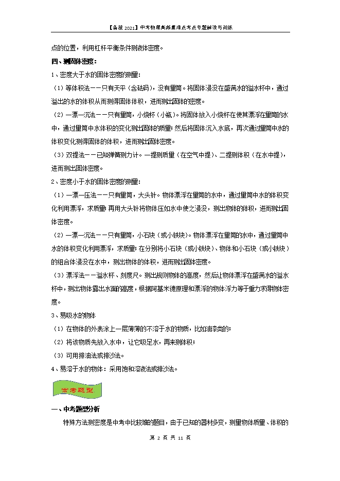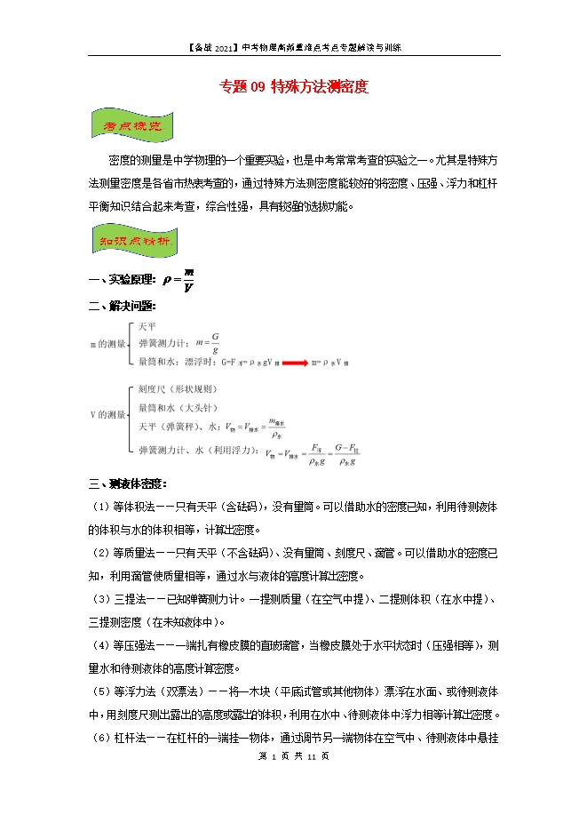 【内容简介】密度的测量是中学物理的一个重要实验,也是中考常常考查的实验之一。尤其是特殊方法测量密度是各省市热衷考查的,通过特殊方法测密度能较好的将密度、压强、浮力和杠杆平衡知识结合起来考查,综合性强,具有较强的选拔功能。 一、实验原理: 二、解决问题: 三、测液体密度:(1)等体积法——只有天平(含砝码),没有量筒。可以借助水的密度已知,利用待测液体的体积与水的体积相等,计算出密度。(2)等质量法——只有天平(不含砝码)、没有量筒、刻度尺、滴管。可以借助水的密度已知,利用滴管使质量相等,通过水与液体的高度计算出密度。(3)三提法——已知弹簧测力计。一提测质量(在空气中提)、二提测体积(在水中提)、三提测密度(在未知液体中)。(4)等压强法——一端扎有橡皮膜的直玻璃管,当橡皮膜处于水平状态时(压强相等),测量水和待测液体的高度计算密度。(5)等浮力法(双漂法)——将一木块(平底试管或其他物体)漂浮在水面、或待测液体中,用刻度尺测出露出的高度或露出的体积,利用在水中、待测液体中浮力相等计算出密度。(6)杠杆法——在杠杆的一端挂一物体,通过调节另一端物体在空气中、待测液体中悬挂点的位置,利用杠杆平衡条件测液体密度。四、测固体密度:1、密度大于水的固体密度的测量:(1)等体积法——只有天平(含砝码),没有量筒。将固体浸没在盛满水的溢水杯中,通过溢出的水的体积从而测得固体体积,进而测出固体的密度。(2)一漂一沉法——只有量筒,小烧杯(小瓶)。将固体放入小烧杯在使其漂浮在量筒的水中,通过量筒中水体积的变化测出固体的质量;然后将固体沉入水底,再次通过量筒中水的体积变化测得固体的体积,进而测出固体密度。(3)双提法——已知弹簧测力计。一提测质量(在空气中提)、二提测体积(在水中提),进而测出固体密度。2、密度小于水的固体密度的测量:(1)一漂一压法——只有量筒,大头针。物体漂浮在量筒的水中,通过量筒中水的体积变化利用漂浮,求质量;再用大头针将物体压如水中使之浸没,测出物体的体积,进而测出固体密度。(2)一漂一沉法——只有量筒,小石块(或小铁块)。物体漂浮在量筒的水中,通过量筒中水的体积变化利用漂浮,求质量;在分别将小石块(或小铁块)、物体和小石块(或小铁块)的组合体浸没在水中,测出物体的体积,进而测出固体密度。(3)漂浮法——溢水杯、刻度尺。测出规则物体的高度,然后让物体漂浮在盛满水的溢水杯中,测出物体露出水面的高度,根据阿基米德原理和漂浮的物体浮力等于重力求得物体密度。3、易吸水的物体(1)在物体的外表涂上一层薄薄的不溶于水的物质,比如油漆类的;(2)将该物质先放入水中,让它吸足水,再来测体积;(3)可用排油法或排沙法。4、易溶于水的物体:采用饱和溶液法或排沙法。