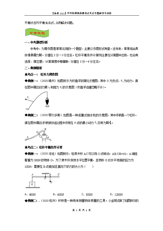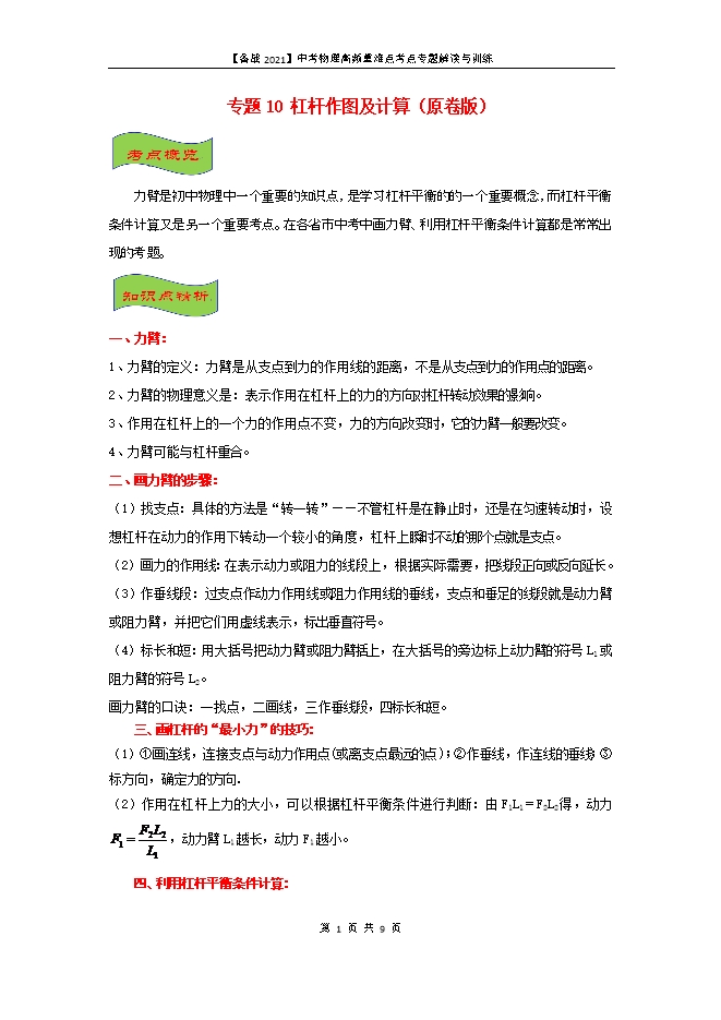 专题10 杠杆作图及计算--【备战2021】中考物理高频重难点考点专题解读与训练(原卷版和解析版)