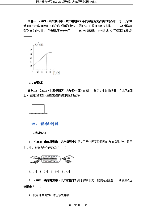 【内容简介】一、目标要求目标要求重、难点知道力的单位是牛顿会正确使用弹簧秤,培养学生的实验操作能力会正确作出力的图示。能根 据力的图示,说出某个力的三个要素重点了解力的示意图的意义和作用,并会用它来表示具体的力难点通过作力的图示训练,培养认真、细致的学习态度二、知识点解析1.实验室测量力的大小工具是:__________。2.弹簧测力计的原理:在弹性限度内,_________________________。3.弹簧测力计的用法:第一步:_____________________;第二步:认清____________和_______________;第三步:使弹簧的伸长和力的方向在_______________上;第四步:读数。4.力的示意图就是用__________________的线段来表示力。画法:第一:找作用点,第二:画箭头(力越大线越长),第三:标出字母和大小三、考查方向1.弹簧测力计原理典例一:(2021•山东烟台市•八年级期末)某同学在探究弹簧的特点时, 得出了弹簧受到的拉力与弹簧的长度的关系如图所示。由图可知:这根弹簧的原长是______cm;弹簧在受到6N的拉力时, 弹簧比原来伸长了______cm;分析图像中有关数据,你可得出的结论是______。 2.力的图示典例二:(2021•上海杨浦区•九年级一模)在图中,重为2牛的物块静止在水平地面上,请用力的图示法画出该物块对地面的压力。 四、模拟训练一、基础练习1.(2020•山东德州市•八年级期中)甲、乙两个同学沿相反的方向拉测力计,各用力2牛,则测力计的示数为( ) A.1牛B.2牛C.0牛D.4牛2.(2021•山东潍坊市•八年级期末)关于弹簧测力计的使用及原理,下列说法不正确的是( )A.使用弹簧测力计时应该先调零B.使用弹簧测力计时必须使其沿竖直方向C.使用过程中,弹簧、指针不能与外壳有摩擦D.在弹性限度内,弹簧受到的拉力越大,弹簧的伸长量就越长3.(2021•全国九年级专题练习)下列关于弹力形成的说法正确的是( )A.将一叠书放在桌面上,我们没有观察到桌面有什么变化,因此桌面没有产生弹力B.风将树枝吹得弯曲,因此树枝产生弹力C.磁铁将一铁片吸得弯曲,但磁铁未与铁片接触,因此铁片不产生弹力D.将一块正方体的橡皮泥捏成一个小兔子形状,因为橡皮泥的形状发生改变,所以小兔子有弹力
