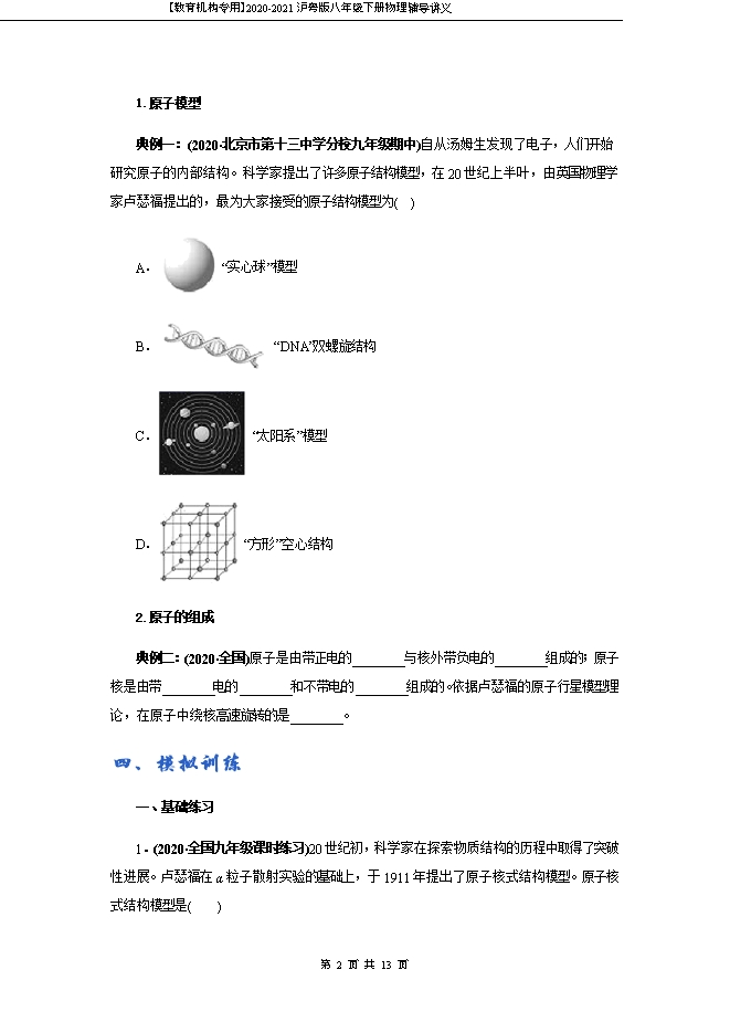 【内容简介】一、目标要求目标要求重、难点知道分子是由原子组成知道原子的结构了解原子的模型建立过程两种原子结构模型的建立重点两种原子结构模型的提出和验证难点二、知识点解析1.分子由_____________组成。可分为_____________分子和______________分子。2.电子是由英国________________通过真空管放电实验发现的,电子带______。3.原子(1)原子结构:卢瑟福发现(核式结构)—______________模型。(2) (3)中子:英国_______________发现,不带电。(4)质子:带___________电。(5)质子和中子统称为______________(原子核)。(6)质子和中子由______________组成。三、考查方向1.原子模型典例一:(2020•北京市第十三中学分校九年级期中)自从汤姆生发现了电子,人们开始研究原子的内部结构。科学家提出了许多原子结构模型,在20世纪上半叶,由英国物理学家卢瑟福提出的,最为大家接受的原子结构模型为( )A. “实心球”模型B. “DNA”双螺旋结构C. “太阳系”模型D. “方形”空心结构2.原子的组成典例二:(2020•全国)原子是由带正电的________与核外带负电的________组成的;原子核是由带________电的________和不带电的________组成的。依据卢瑟福的原子行星模型理论,在原子中绕核高速旋转的是________。四、模拟训练一、基础练习1.(2020•全国九年级课时练习)20世纪初,科学家在探索物质结构的历程中取得了突破性进展。卢瑟福在α粒子散射实验的基础上,于1911年提出了原子核式结构模型。原子核式结构模型是( )A.关于分子结构的理论B.关于原子结构的理论C.关于原子核结构的理论D.关于电子结构的理论2.(2020•全国九年级课时练习)关于分子、原子,下列说法正确的是( )A.物质是由分子和原子构成的B.原子就是分子C.一粒灰尘就是一个分子D.分子的直径约1mm3.(2021•全国九年级课时练习)关于粒子和宇宙,下列认识中正确的是( )A.固体物质的分子是静止不动的B.原子由原子核和电子组成C.分子间只有引力没有斥力D.太阳是宇宙的中心且固定不动4.(2020•全国九年级课时练习)关于质子和中子的说法正确的是A.质子带正电,中子带负电B.质子不带电,中子带负电C.质子带正电,中子不带电D.质子、中子都带正电