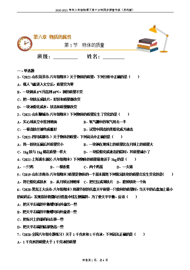 【内容简介】1.(2021•山东菏泽市•八年级期末)关于物体的质量,下列分析中正确的是( )A.载人飞船进入太空后,质量变为零B.一块铜从0℃升高到60℃,铜的质量不变C.把一块铁压成铁片,形状和质量都改变D.一块冰熔化成水,状态和质量都改变【答案】B【详解】A.载人飞船进入太空后改变了地理位置,质量不变,故A错误;B.一块铜温度从0℃升高到60℃,改变了温度,铜的质量保持不变,故B正确;C.铁块压成铁片,改变了形状,质量不变,故C错误;D.冰熔化成水,改变了状态,质量不变,故D错误。故选B。2.(2021•山东聊城市•八年级期末)下列物体的质量发生了变化的是( )A.实心球从空中落到地面B.氧气罐中的氧气用去一半C.一根直铁丝被弯成弧形D.试管中固态的荼熔化成为液态【答案】B【详解】A.实心球从空中落到地面,位置发生了变化,但是铁球中含铁的量没有变,故质量不变,故A选项不符合题意;B.氧气罐中的氧气用去一半,氧气的含量减少了,故质量发生了变化,故B选项符合题意;C.一根直铁丝被弯成弧形,形状改变了,含铁的量没有变,故质量不发生变化,故C选项不符合题意;D.试管中固态的荼熔化成为液态,物态变了,碘的含量没有发生变化,故质量不变,故D选项不符合题意。故选B。3.(2021•四川成都市•)关于物体的质量,下列说法中正确的是( )A.将一铁块压扁后其质量变小B.一块铜在地球上的质量比在月球上的质量大C.1kg铁与1kg棉花质量一样大D.一块铅熔化成液态的铅时,其质量减小了【答案】C【详解】质量是物体内所含物质的多少,质量不因形状的改变而改变、不因位置的改变而改变、不因状态的改变而改变。A.将一铁块压扁后铁的形状改变,其质量不变,故A错误;B.铜块在地球上和在月球上位置改变,铜块质量不变,故B错误;C.1kg铁与1kg棉花所含物质的多少一样,所以质量一样大,故C正确;D.一块铅熔化成液态的铅时状态改变,其质量不变,故D错误。故选C。4.(2021•上海浦东新区•八年级期末)下列物体的质量最接近于3kg的是( )A.一只鸡B.一根香蕉C.两个鸡蛋D.一头猪【答案】A【详解】一只鸡的质量约为3kg,一根香蕉的质量约为300g,两个鸡蛋的质量约100g,一头猪的质量约100kg。故选A。5.(2019•山东济南市•八年级期末)质量是物体的一个基本属性下列情况铁块的质量会发生变化的是( )A.将它熔化成铁水B.从月球运到地球C.把它压成薄铁片D.磨掉铁块一个角【答案】D【详解】ABC.质量指的是物体所含物质的多少,质量是物体的一种属性,它不随物体的形状、位置、温度、状态的改变而改变,故ABC不符合题意;D.磨掉铁块一个角,铁块所含铁物质减小了,所以质量发生了变化,故D符合题意。故选D。6.(2020•黑龙江大庆市•八年级期末)用调节好的托盘天平称量一只烧杯的质量时,当天平的右盘加上最小的砝码后,发现指针稍微向分度盘中线左侧偏斜,为了使天平平衡,应该( )A.把天平右端的平衡螺母向外旋出一些B.把天平右端的平衡螺母向外旋进一些C.把标尺上的游码向右移一些D.把天平右端的底部垫高一些【答案】C【详解】天平的右盘加上最小的砝码后,发现指针稍微向分度盘中线左侧偏斜,说明物体的质量大于砝码质量,此时已经加入最小质量的砝码,所以应该通过向右调节游码使天平平衡。故选C。
