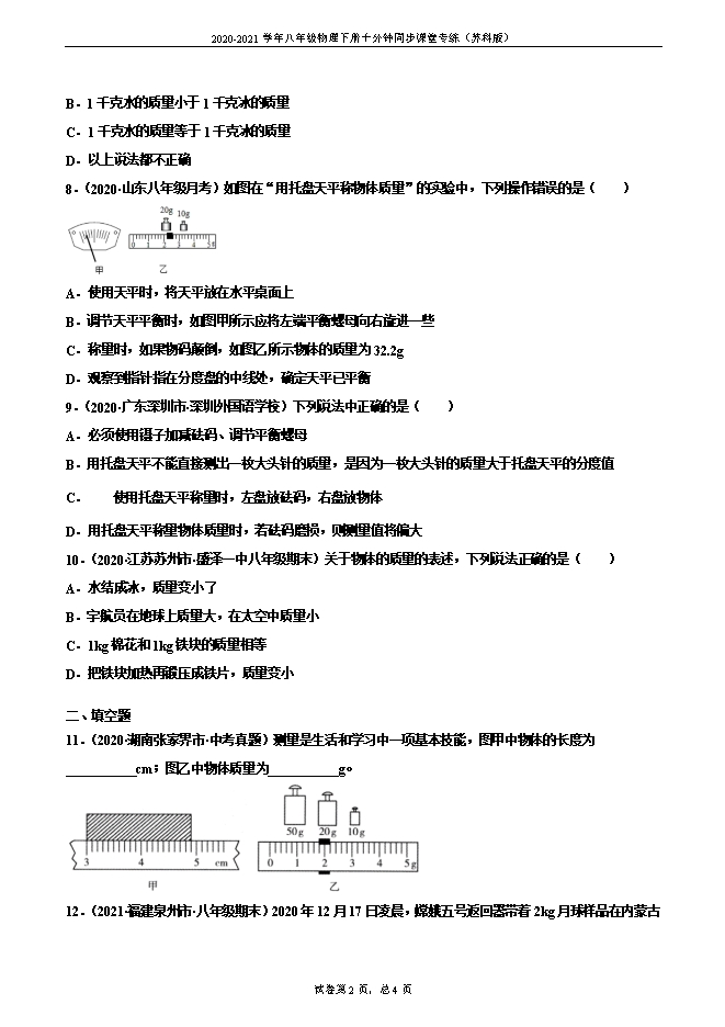 6.1 物体的质量(重点练)-2020-2021学年八年级物理下册十分钟同步课堂专练(苏科版)