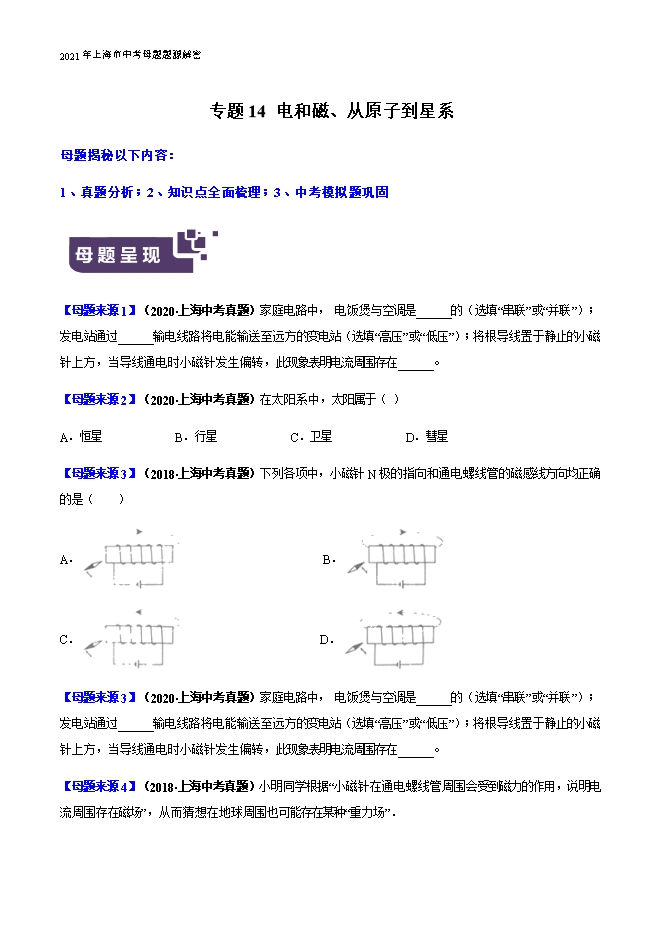 【内容简介】【母题来源1】(2020•上海中考真题)家庭电路中, 电饭煲与空调是______的(选填“串联”或“并联”);发电站通过______输电线路将电能输送至远方的变电站(选填“高压”或“低压”);将根导线置于静止的小磁针上方,当导线通电时小磁针发生偏转,此现象表明电流周围存在______。【答案】并联 高压 磁场 【解析】[1]在家庭电路中,电饭煲与空调之间工作相互不影响,是以并联的方式连接。[2]在输送功率一定时,电压越高,电流越小,输送过程中能量损失越小,所以从发电站到用电区采用高压输电。[3]在静止的小磁针上方,放一根导线,给导线通电时磁针将偏转,说明了通电导体周围存在磁场。【母题来源2】(2020•上海中考真题)在太阳系中,太阳属于( )A.恒星B.行星C.卫星D.彗星【答案】A【解析】太阳是能够发光发热的,离我们最近的恒星;地球和水星是太阳的行星;而月球是地球的一颗卫星。故选A。【母题来源3】(2018•上海中考真题)下列各项中,小磁针N极的指向和通电螺线管的磁感线方向均正确的是( )A. B. C. D. 【答案】A【解析】四幅图中电流方向和线圈的绕法都相同,且电流从右前方流入、左后方流出,根据安培定则,伸出右手,四指弯曲所指的方向为电流的方向,则大拇指指向通电螺线管的左端为N极,螺线管的右端为S极;在磁体外部,磁感线方向由N极指向S极,则磁感线方向向右,故CD错误;由磁极间的相互作用规律可知,小磁针左下端为N极,右上端为S极,故A正确,B错误.故选A.【母题来源3】(2020•上海中考真题)家庭电路中, 电饭煲与空调是______的(选填“串联”或“并联”);发电站通过______输电线路将电能输送至远方的变电站(选填“高压”或“低压”);将根导线置于静止的小磁针上方,当导线通电时小磁针发生偏转,此现象表明电流周围存在______。【答案】并联 高压 磁场 【解析】[1]在家庭电路中,电饭煲与空调之间工作相互不影响,是以并联的方式连接。[2]在输送功率一定时,电压越高,电流越小,输送过程中能量损失越小,所以从发电站到用电区采用高压输电。[3]在静止的小磁针上方,放一根导线,给导线通电时磁针将偏转,说明了通电导体周围存在磁场。【母题来源4】(2018•上海中考真题)小明同学根据“小磁针在通电螺线管周围会受到磁力的作用,说明电流周围存在磁场”,从而猜想在地球周围也可能存在某种“重力场”. ①小明猜想的依据是_____.②同一物体在月球上受到的重力大约是地球的六分之一,推测月球上的“重力场”比地球的要_____(填“强”或“弱”).③根据通电螺线管的磁场分布,小明推测重力场的最可能是下列那个图_____.【答案】地球附近的物体受到重力的作用 弱 甲 【分析】(1)根据物体在地球附近受到重力猜想在地球周围也可能存在某种“重力场”,(2)根据同一物体重力的大小,判断重力场的强弱;(3)根据“重力方向竖直向下”推测重力场的分布.【解析】(1)根据“地球附近的物体受到重力的作用”,猜想在地球周围也可能存在某种“重力场”;(2)月球上受到的重力大约是地球的六分之一,重力场越强,重力越大,推测月球上的“重力场”比地球的要弱;(3)根据重力方向竖直向下,基本上指向地心的方向,类比在磁场中,小磁针受力方向为磁感线的切线方向,故图甲最有可能是“重力场”的分布.故答案为(1). 地球附近的物体受到重力的作用 (2). 弱 (3). 甲【点睛】本题为猜想题,考查了重力的有关内容;关键是根据所学知识,得出正确结论,考查学以致用的能力.【母题来源5】(2017•上海中考真题)研究发现,人体内部存在磁场,人体内部的磁场与人体健康密切相关.①人体内部的磁场与地磁场相比很弱,若用磁感线描述人体内部的磁场和地磁场,则下列判断中合理的是_____(选填:A、B或C).A.人体内部磁场的磁感线分布较疏B、人体内部磁场的磁感线分布较密C、两者磁场的磁感线疏密大致相同②对人体内部磁场存在的原因提出猜想,请写出一种猜想及其依据_____【答案】A 电流周围有磁场,人体内也有电流 【分析】(1)为了形象、准确的描述磁场,我们用一些带箭头的曲线来表示,这样的曲线叫磁感线,磁感线也是假想出来的,不是真实存在的;但磁场是确确实实存在.(2)地磁场的南极在地球的北极附近,地磁场的北极在地球的南极附近,地球的南北极与地磁场的南北极是不重合的.【解析】①磁场越强,反映在磁感线上分布较密,磁场越弱,反映在磁感线上分布较疏;人体内部的磁场与地磁场相比很弱,若用磁感线描述人体内部的磁场和地磁场,则人体内部磁场的磁感线分布较疏,故选a;②根据奥斯特实验,通电导体周围有磁场,对人体内部磁场存在的原因提出猜想:电流周围有磁场,人体内有电流【母题来源6】(2016•上海中考真题)根据图中通电螺线管的N极,标出磁感线方向、小磁针的N极,并在括号内标出电源的正、负极.