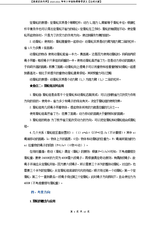 【内容简介】二、知识点解析1.滑轮定义:周边有槽,中心有一转动的轮子叫滑轮。因为滑轮可以连续旋转,因此可看作是能够连续旋转的杠杆,仍可以用杠杆的平衡条件来分析。根据使用情况不同,滑轮可分为定滑轮和动滑轮。2.定滑轮(1)定义:工作时,中间的轴固定不动的滑轮叫定滑轮。(2)实质:是个等臂杠杆。轴心O点固定不动为支点,其动力臂和阻力臂都等于圆的半径r,根据杠杆的平衡条件可知,因为重物匀速上升时不省力。(3)特点:不省力,但可改变力的方向。所谓“改变力的方向”是指我们施加某一方向的力能得到一个与该力方向不同的力。(4)动力移动的距离与重物移动的距离相等。对于定滑轮来说,无论朝哪个方向用力,定滑轮都是一个等臂杠杆,所用拉力都等于物体的重力G。(不计绳重和摩擦)3.动滑轮(1)定义:工作时,轴随重物一起移动的滑轮叫动滑轮。(2)实质:是一个动力臂为阻力臂二倍的杠杆。(3)特点:省一半力,但不能改变力的方向。(4)动力移动的距离是重物移动距离的2倍。对于动滑轮来说:1)动滑轮在移动的过程中,支点也在不停地移动;2)动滑轮省一半力的条件是:动滑轮与重物一起匀速移动,动力F1的方向与并排绳子平行,不计动滑轮重、绳重和摩擦。4.滑轮组(1)定义:由若干个定滑轮和动滑轮匹配而成。(2)特点:可以省力,也可以改变力的方向。使用滑轮组时,有几段绳子吊着物体,提起物体所用的力就是物重的几分之一,即 (条件:不计动滑轮、绳重和摩擦)。注意:如果不忽略动滑轮的重量则: 。(3)动力移动的距离S和重物移动的距离h的关系是:使用滑轮组时,滑轮组用n段绳子吊着物体,提起物体所用的力移动的距离就是物体移动距离的n倍,即S=nh。(4)绳子端的速度与物体上升的速度关系: 。三、重点、难点与易错点★重点一:滑轮有两种:定滑轮和动滑轮。1.定滑轮:使用时,滑轮的位置固定不变;定滑轮实质是等臂杠杆,不省力也不费力,但可以改变作用力方向。定滑轮的特点:使用定滑轮不省力但能改变力的方向。在不少情况下,改变力的方向会给工作带来方便。定滑轮的原理:定滑轮实质是个等臂杠杆,动力L1阻力L2臂都等于滑轮半径。根据杠杆平衡条件也可以得出定滑轮不省力的结论。定滑轮在工作时,滑轮的轴固定不动,使定滑轮吊起物体时,只是为了改变力的作用方向,使达到操作方便的目的。2.动滑轮:使用时,滑轮随重物一起移动;动滑轮实质是动力臂为阻力臂二倍的杠杆,省1/2力多费1倍距离。动滑轮的特点:使用动滑轮能省一半力,费距离。这是因为使用动滑轮时,钩码由两段绳子吊着,每段绳子只承担钩码重的一半。使用动滑轮虽然省了力,但是动力移动的距离大于钩码升高的距离,即费了距离。动滑轮向上提绳子可以将重物和挂着重物的动滑轮一起提到最高处。相比于所提升的重物动滑轮通常很轻,其所受重力可以忽略动滑轮的原理:动滑轮实质是个动力臂(L1)为阻力臂(L2)二倍的杠杆。★重点二:滑轮组及其应用1.滑轮组:滑轮组是由若干个定滑轮和动滑轮匹配而成,可以达到既省力又改变力作用方向的目的。使用中,省力多少和绳子的绕法有关,决定于滑轮组的使用效果。2.滑轮组用几段绳子吊着物体,提起物体所用的力就是总重的几分之一。使用滑轮组虽然省了力,但费了距离,动力移动的距离大于重物移动的距离。3.滑轮组的用途:为了既节省又能改变动力的方向,可以把定滑轮和动滑轮组合成滑轮组。4.几个关系(滑轮组竖直放置时):(1)s=nh ;(2)F=G总 /n(不计摩擦);其中 s:绳端移动的距离,h:物体上升的高度,G总:物体和动滑轮的总重力,F:绳端所施加的力 n:拉重物的绳子的段数(F=1/n×(G物+G动))。在绕时遵循:奇动(滑轮)偶定(滑轮)的原则:根据F=(1/n)G可知,不考虑摩擦及滑轮重,要使2400N的力变为400N需六段绳子,再根据偶定奇动原则,有偶数段绳子,故绳子开端应从定滑轮开始,因为要六段绳子,所以需要三个并列的整体动滑轮,对应的,也需要三个并列的定滑轮,从定滑轮组底部的勾勾处绕起,顺次绕过第一个动滑轮,第一个定滑轮,第二个…直到最后一段绳子绕过第三个定滑轮,此时绳子方向即向下,且会使拉力为400N(不考虑摩擦与滑轮重)。四、考查方向1.滑轮的概念与应用