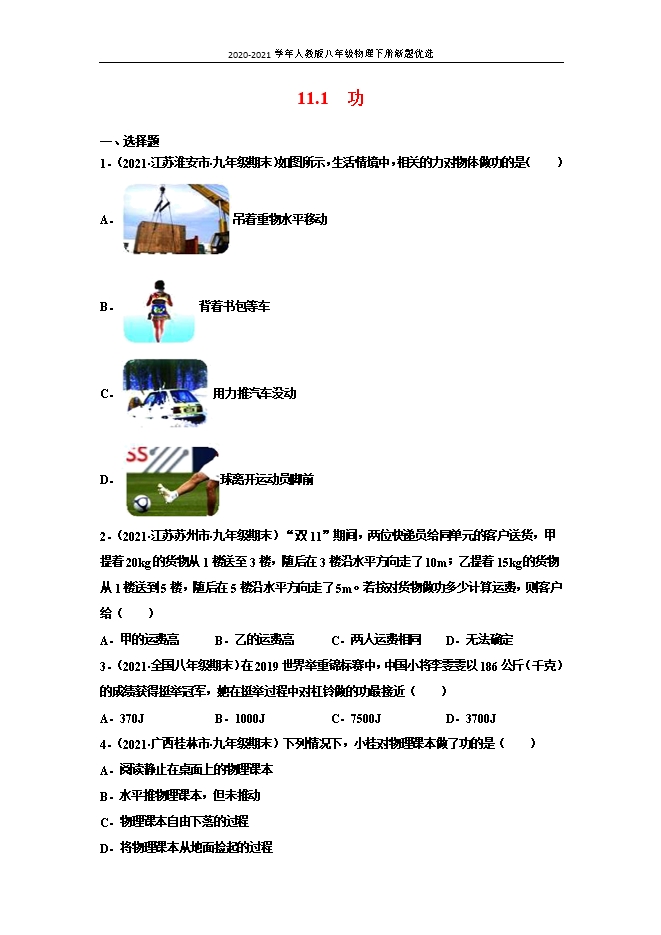【内容简介】1.(2021•江苏淮安市•九年级期末)如图所示,生活情境中,相关的力对物体做功的是( )A. 吊着重物水平移动B. 背着书包等车C. 用力推汽车没动D. 球离开运动员脚前【答案】D【详解】A.吊着重物水平移动,吊车用力向上,与重物移动的距离方向垂直,故吊车没有对物体做功,故A不符合题意;B.背着书包等车,人对书包用了力,但在力的方向上没有移动距离,故人对书包没有做功,故B不符合题意;C.用力推汽车没动,人对车用了力,但在力的方向上没有移动距离,故人对车没有做功,故C不符合题意;D.球离开运动员脚前,人对球用了力,球在力的方向上移动了距离,故人对球做了功,故D符合题意。故选D。2.(2021•江苏苏州市•九年级期末)“双11”期间,两位快递员给同单元的客户送货,甲提着20kg的货物从1楼送至3楼,随后在3楼沿水平方向走了10m;乙提着15kg的货物从1楼送到5楼,随后在5楼沿水平方向走了5m。若按对货物做功多少计算运费,则客户给( )A.甲的运费高B.乙的运费高C.两人运费相同D.无法确定【答案】B【详解】人在水平地面上走的过程中,拉力是竖直向上的,而货物是在水平方向上移动距离的,此过程中人对货物不做功;只有货物上升时,人要克服货物的重力做功;一层楼的高度约为3m,则甲对货物做的功W甲=G甲货h甲=m甲货gh甲=20kg×10N/kg×(3-1)×3m=1200J乙对货物做的功W乙=G乙货h乙=m乙货gh乙=15kg×10N/kg×(5-1)×3m=1800J由以上计算可知,乙对货物做的功多,即乙的运费高。故选B。3.(2021•全国八年级期末)在2019世界举重锦标赛中,中国小将李雯雯以186公斤(千克)的成绩获得挺举冠军,她在挺举过程中对杠铃做的功最接近( )A.370JB.1000JC.7500JD.3700J【答案】D【详解】杠铃的重力 李雯雯的身高约为1.6m;在挺举过程中,把杠铃举高的高度约为2m,则在挺举过程中对杠铃做的功 与D选项数据接近,故ABC不符合题意,D符合题意。故选D。4.(2021•广西桂林市•九年级期末)下列情况下,小桂对物理课本做了功的是( )A.阅读静止在桌面上的物理课本B.水平推物理课本,但未推动C.物理课本自由下落的过程D.将物理课本从地面捡起的过程【答案】D【详解】A.物理课本没有移动距离,故不做功,故A选项不符合题意;B.水平推物理课本,但未推动,没有在力的方向上移动距离,故为劳而无功,故B选项不符合题意;C.物理课本自由下落的过程,小桂没有力作用在物理书上,故C选项不符合题意;D.将物理课本从地面捡起的过程,在力的方向上移动了距离,故做了功,故D选项符合题意。故选D。5.(2021•江苏苏州市•九年级期末)快递小哥宋学文作为一名普通劳动者当选2020年全国劳模,有关宋学文在工作中对货物做功情况叙述正确的是( )A.把货物从地上搬上运输车,他对货物没有做功B.货物太重未搬动,他对货物做了功C.抱着货物上楼时,他对货物做了功D.抱着货物在原地等待签收时,他对货物做了功【答案】C【详解】做功的两个必要条件:一是物体要受力的作用,二是物体要在力的方向上通过一定的距离:A.把货物从地上搬上运输车,在力的方向上通过一定的距离,他对货物做功,故A错误;B.货物太重未搬动,物体要在力的方向上未通过距离,他对货物未做功,故B错误;C.抱着货物上楼时,他对货物做了功,满足做功的两个必要条件,他对货物做了功,故C正确;D.抱着货物在原地等待签收时,物体要在力的方向上未通过距离,他对货物未做功,故D错误。故选C。6.(2021•江苏南京市•九年级期末)在甲、乙两图中,甲地面粗糙,乙地面光滑,质量分别为 m、2m 的两个物体在大小为 F的水平恒力作用下。在力的方向上前进了相同的距离,则下列结论正确的是( ) A.甲图中 F 做的功小于乙图中 F 做的功B.甲图中 F 做的功大于乙图中 F 做的功C.甲图中 F 做的功等于乙图中 F 做的功D.条件不足,无法确定【答案】C【详解】根据题意,两个物体在大小为F的恒力作用下,在力的方向上前进了相同的距离s,根据W=Fs可知,甲图中F做的功等于乙图中F做的功。故选C。7.(2021•江苏九年级期末)弹弓是我们小时候经常玩的玩具,如果弹弓对质量为50g的弹丸的作用力为150N,弹丸被弹弓射出的最大水平飞行距离为30m,则弹弓对弹丸做功情况下列说法正确的是