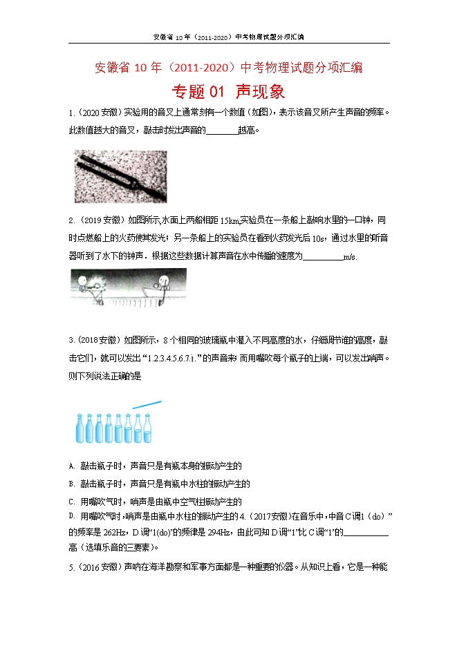 专题01 声现象--安徽省10年(2011-2020)中考物理试题分项汇编(原卷版和解析版)