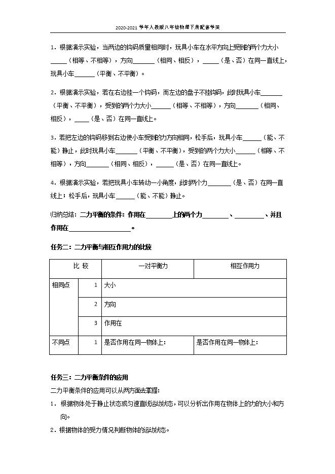 【内容简介】【学习目标】1. 认识到在平衡力作用下,物体保持静止或匀速直线运动状态。 2.知道物体的两种平衡状态,知道平衡力的概念. 3.认识二力平衡的条件,理解二力平衡的条件。4.应用二力平衡的知识分析、解决简单的问题知识与技能。学习过程:【自主学习】思考:你见过的哪些物体受到力的作用并保持静止状态?(1)教室内的吊灯受到 和 力,吊灯保持静止。(2)放在地上的水桶受 力和地面对它的 力,水桶静止。(3)一列火车在一段平直的轨道上匀速行驶,火车受 力、支持力、水平向前的牵引力和向后的 力。教师归纳:物体在受到几个力作用时,如果物体保持 或 状态,我们就说该物体处于平衡状态,使物体处于平衡状态的几个力称做 ;其实就是这几个力的作用效果相互抵消,相当于 ,我们也称此时物体所受合力为零。【合作探究】任务一:二力平衡的条件提出问题:如果一个物体在两个力的作用下平衡,我们称为二力平衡,那么二力平衡的条件是什么呢?下面通过实验来探究1.根据演示实验,当两边的钩码质量相同时,玩具小车在水平方向上受到的两个力大小 (相等、不相等),方向 (相同、相反), (是、否)在同一直线上,玩具小车 (平衡、不平衡)。2.根据演示实验,若在右边挂一个钩码,而左边的盘子不挂钩码,此时玩具小车 (平衡、不平衡),受到的两个力大小 (相等、不相等),方向 (相同、相反), (是、否)在同一直线上。3.若把左边的钩码移到右边使小车受到的力方向相同,松手后,玩具小车 (能、不能)静止,此时玩具小车 (平衡、不平衡),受到的两个力大小 (相等、不相等),方向 (相同、相反), (是、否)在同一直线上。4.根据演示实验,若把玩具小车转动一小角度,此时两个力 (是、否)在同一直线上;松手后,玩具小车 (能、不能)静止。归纳总结:二力平衡的条件:作用在 上的两个力 、 、并且作用在 。任务二:二力平衡与相互作用力的比较