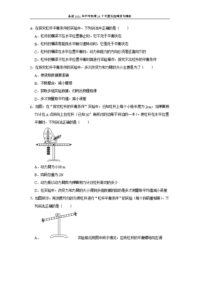 实验18 探究杠杆平衡的条件--备战2021年中考物理25个专题实验精讲与精练