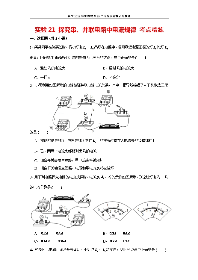 实验21 探究串、并联电路中电流规律--备战2021年中考物理25个专题实验精讲与精练
