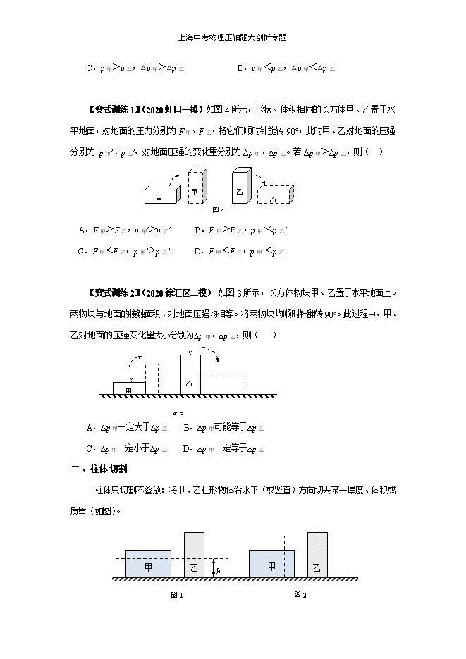 【内容简介】一、柱体转动一般情况下,是指柱形物体转动90º后,分析比较压强的变化情况。 1. 柱体旋转后,对水平面的压力F不变,受力面积S会发生变化,所以压强会变化。一般情况下,用P=F/S=mg/S 或P=ρgh分析。2. 压强的变化量ΔP=P2-P1= "F" /"S2 " -"F" /"S1 " = "F(S1- S2)" /"S1 S2 " 例题1.(2019上海中考题)如图2所示,长方体物块甲、乙置于水平地面上,物块和地面的接触面积分别为S、S'(S﹤S'),对地面的压强相等。将甲、乙均顺时针旋转90°,此时甲、乙和地面的接触面积分别为S'、S,对地面的压强分别为p甲、p乙。此过程中,甲、乙对地面的压强变化量大小分别为△p甲、△p乙,则( ) A.p甲<p乙,△p甲=△p乙B.p甲>p乙,△p甲=△p乙C.p甲>p乙,△p甲>△p乙 D.p甲<p乙,△p甲<△p乙【答案】D。【解析】(1)甲、乙的底面积分别为S、S'(S<S'),甲、乙压强相等,根据F=pS,可以判断甲对水平地面的压力小于乙对水平地面的压力。甲、乙是长方体,当甲、乙顺时针旋转90°后,甲、乙的底面积分别为S'、S,甲的受力面积增大,甲对水平地面的压力不变,甲对水平地面的压强减小;乙的受力面积减小,乙对水平地面的压力不变,乙对水平地面的压强增大,由于原来甲乙对水平地面的压强相等,所以旋转后甲对水平地面的压强小于乙对水平地面的压强,即P甲<P乙。(2)甲、乙对地面的压强变化量ΔP=P-P'= "F" /"S " -"F" /"S' " = "F(S'- S)" /"S S' " 因为面积变化"(S'- S)" /"S S' " 相同,甲对地面的压力小于乙对地面的压力,所以甲对水平地面的压强变化量小于乙对地面的压强变化量即△p甲<△p乙。故选D。【变式训练1】(2020虹口一模)如图4所示,形状、体积相同的长方体甲、乙置于水平地面,对地面的压力分别为F甲、F乙,将它们顺时针旋转90°,此时甲、乙对地面的压强分别为 p甲′、p乙′,对地面压强的变化量分别为Δp甲、Δp乙。若Δp甲>Δp乙,则( ) A.F甲>F乙,p甲′>p乙′ B.F甲>F乙,p甲′<p乙′C.F甲<F乙,p甲′>p乙′ D.F甲<F乙,p甲′<p乙′【答案】A【解析】①长方体甲、乙形状、体积相同,设甲原来与地面的接触面积为S大,顺时针旋转90°后与地面的接触面积为S小,则乙原来与地面的接触面积为S小,顺时针旋转90°后与地面的接触面积为S大,甲对地面压强的变化量为△p甲=P-P'= "F甲" /"S 大" -"F甲" /"S小 " = "F甲(S大- S小)" /"S大 S小 " 乙对地面压强的变化量为△p乙=P-P'= "F乙" /"S 大" -"F乙" /"S小 " = "F乙(S大- S小)" /"S大 S小 " ②若△p甲>△p乙,即"F甲(S大- S小)" /"S大 S小 " >"F乙(S大- S小)" /"S大 S小 " ,则F甲>F乙;顺时针旋转90°后,甲对地面的压强为 p甲′="F甲" /"S小 " ,乙对地面的压强为 p乙′="F乙" /"S大 " ,因为F甲>F乙,S小<S大,故p甲′> p乙′。故选A。【变式训练2】(2020徐汇区二模) 如图3所示,长方体物块甲、乙置于水平地面上。两物块与地面的接触面积、对地面压强均相等。将两物块均顺时针翻转90o。此过程中,甲、乙对地面的压强变化量大小分别为∆p甲、∆p乙,则( ) A.∆p甲一定大于∆p乙 B.∆p甲可能等于∆p乙C.∆p甲一定小于∆p乙 D.∆p甲一定等于∆p乙【答案】B。【解析】①由于两物块与地面的接触面积、对地面压强均相等,根据F=PS可知,压力相等。根据p=ρgh可知,甲、乙密度的大小关系为ρ甲>ρ乙。②将两物块均顺时针翻转90o后,压力不变仍相等,但是受力面积不确定,根据p=F/S无法判断压强的大小,所以无法比较压强的变化量;根据P=ρgh,因为ρ甲>ρ乙,h甲<h乙。所以也无法分析判断压强变化量的大小情况,可能存在三种情况:∆p甲>∆p乙、∆p甲<∆p乙、∆p甲=∆p乙。 故选B。二、柱体切割柱体只切割不叠放:将甲、乙柱形物体沿水平(或竖直)方向切去某一厚度、体积或质量(如图)。 1. 可以用P=F/S 或 P=ρgh分析判断压强,根据题目给的已知条件选用;2. 变化的压强ΔP=ΔF/S=Δmg/S、ΔP=ρgΔh或ΔP=P原来-P后来等分析计算;3. 沿竖直方向切割,剩余部分(或切去部分)的压强不变。4. 变化的压力可以用ΔF=Δmg、 ΔF=ΔPS、 ΔF=mg/n(n为比例)或ΔF=F1-F2等分析计算。例题2.(2021上海市青浦区一模)均匀正方体甲、乙置于水平地面上,对水平地面的压强分别为p甲、p乙。现沿水平方向切去部分后,如图2所示,甲、乙剩余部分的高度和质量均相等。下列关于甲、乙的密度ρ甲、ρ乙和甲、乙正方体对水平地面的压强p甲、p乙大小的判断,正确的是( )