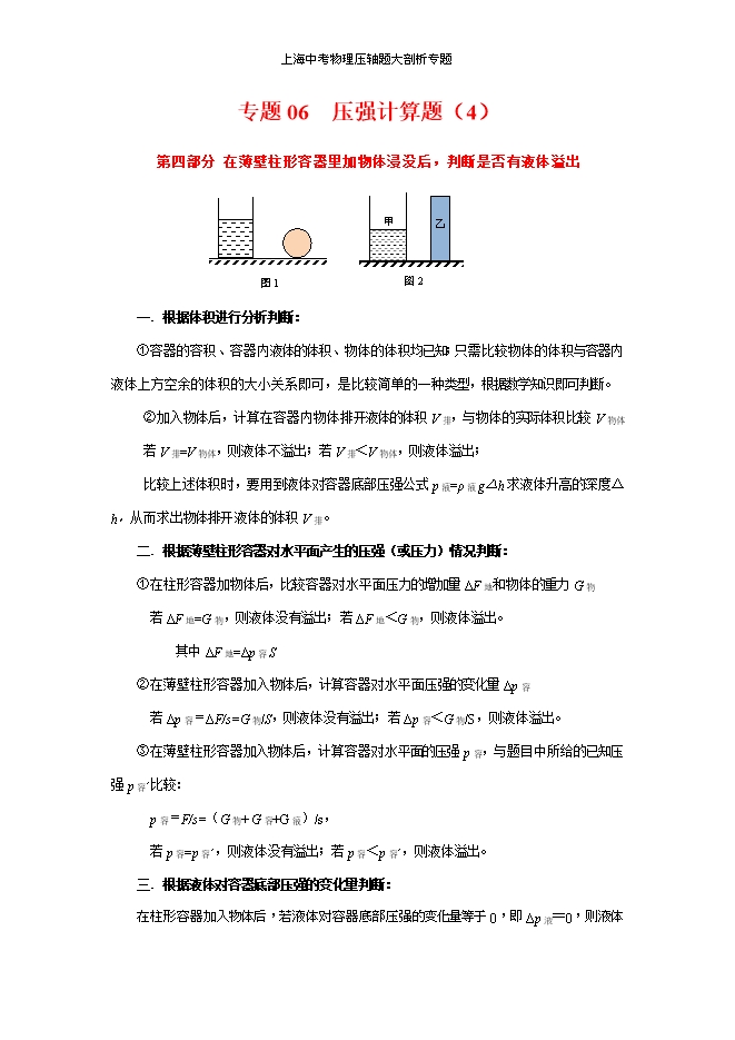 上海中考物理压轴题大剖析专题:06 压强计算题(4)第四部分 在薄壁柱形容器里加物体浸没后,判断是否有液体溢出(原卷版和解析版)