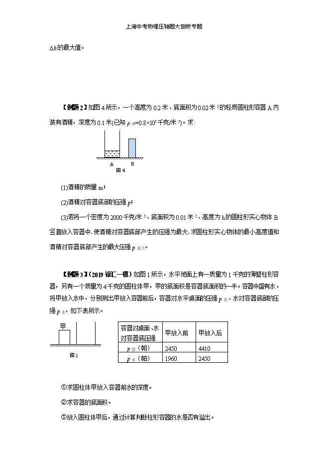 - 203上海中考物理压轴题大剖析专题:06 压强计算题(4)第四部分 在薄壁柱形容器里加物体浸没后,…