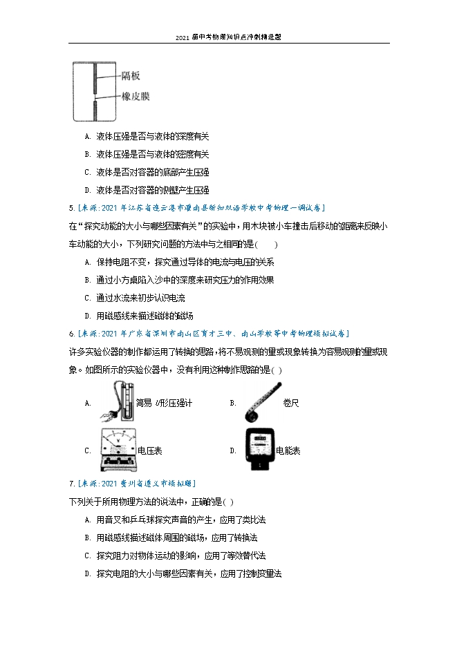 【内容简介】1.自然界中的物体是多种多样的,大石块重,小石块轻,木块也是这样,但没有石块重,有些很小的物体却特别重,同学们根据这些生活经验能提出的,最有探究价值且易于探究他问题是( )A. 物体的质量与体积是否有关?B. 物体的质量和体积有什么关系?C. 质量与体积的比值是否是定值?D. 物体的密度与哪些因素有关?【答案】B【解析】物理来源于生活,服务于社会,生活中处处皆物理,留心观察就能发现很多易于探究的好问题。根据题意分析“大石块重,小石块轻,木块也是这样和木块没有石块重,有些很小的物体却特别重”原因,据此提出最有探究价值且易于探究他问题。【解答】本题考查探究问题的选择。物体的质量与体积是否有关不具有探究价值,A错误;物体的质量和体积有什么关系更具有探究价值且易于探究,B正确;质量和体积的比值是否是定值,这个猜想从题干现象中是无法直接猜想出的,C错误;从题干现象无法直接猜想出密度与哪些因素有关,D错误。故选 B。2.[来源:2021年江苏省无锡市锡山区天一实验学校中考物理适应性试卷(3月份)]这一个月里我们在课堂上学会了许多物理研究方法。下列四个探究实验中,运用了相同研究方法的是( )①研究蒸发的快慢与哪些因素有关②研究真空不能传声③用水波来理解声波④探究不同材料的隔音性能A. ①②B. ①④C. ③④D. ②③【答案】B【解析】①液体蒸发快慢与多个因素有关,在研究蒸发的快慢与哪些因素的有关时,运用的是“控制变量法”;②研究真空不能传声:先实验--随着罩内空气的不断抽出,听到铃声越来越弱;再推理--如果罩内被抽成真空,将听不到铃声,由此可以推出“声音不能在真空中传播”,运用的是“科学推理法;③声波不能直接观察,利用水波的传播特点说明声波的传播特点,运用的是“类比法”;④探究材料的隔声性能时,一般控制材料,改变距离;或控制距离,改变材料,运用的是“控制变量法”。研究方法相同的是①④。故选:B。明确每个实例探究过程运用的方法,确定符合题意的选项。本题主要考查学生对物理学研究方法的了解和掌握,属于基本方法的考查。3.[来源:2021年四川省成都市青羊区树德实验中学中考物理一诊试卷]在科学探究中,常把直接测量有困难的量转换成便于测量的量来研究。这种方法称之为转换法。例如在探究物质吸热升温的属性时,沙子和水吸收热量的多少不便直接测量,可以通过测量加热时间的长短来比较吸热的多少。下述实验中采用了转换法的是( )A. 在探究影响动能大小的因素时,通过木块推动的距离比较动能的大小B. 在探究阻力对物体运动的影响时,推理出物体不受阻力时的运动状态C. 在探究串联电路电流特点时,换用不同灯泡及改变电源电压,多次实验D. 在探究压力对滑动摩擦力的影响时,保持接触面粗糙程度不变,改变压力【答案】A【解析】A、在探究影响动能大小的因素时,动能大小是通过木块被撞击后移动的距离来判断的,是转换法,故A符合题意;B、在探究阻力对物体运动的影响时,推理出物体不受阻力时的运动状态,是实验推理法,故B不符合题意;C、在探究串联电路电流特点时,换用不同灯泡及改变电源电压,多次实验;寻找普遍规律;是归纳法,故C不符合题意;D、在探究压力对滑动摩擦力的影响时,保持接触面粗糙程度不变,改变压力;采用的是控制变量法,故D不符合题意;故选:A。转换法是中学物理中把直接测量有困难的量转换成便于测量的量来研究的一种重要的研究方法,也就是借助某些物体的特性来研究看不到或不易观察到物质,形象直观。要解答本题应掌握物理研究中常常用到“控制变量法”、“等效替代法”、“归纳法”、“推理法”、”转换法“等方法。4.[来源:2021年吉林省长春市中考物理模拟试卷(三)]用隔板将玻璃容器均分为两部分,隔板中有一小孔用薄橡皮膜封闭(如图)。下列问题中不能用该装置探究的是( ) A. 液体压强是否与液体的深度有关B. 液体压强是否与液体的密度有关C. 液体是否对容器的底部产生压强D. 液体是否对容器的侧壁产生压强【答案】C【解析】A、在隔板两边倒入同一种液体,使其深度不同,观察橡皮膜凸起的方向可知两侧液体压强的大小,可探究液体压强是否与液体的深度有关;故A不合题意;B、在隔板两边倒入密度不同的液体,使其深度相同,观察橡皮膜凸起的方向可知两侧液体压强的大小,可探究液体压强是否与液体的密度有关;故B不合题意;C、由于隔板是竖直放置的,所以该装置无法探究液体是否对容器的底部产生压强。故C符合题意;D、在隔板的某一边倒入某种液体,观察橡皮膜是否凸起可知液体是否对容器的侧壁产生压强,可探究液体是否对容器的侧壁产生压强。故D不合题意。故选:C。此题是探究液体压强与深度和密度的关系,考查了对控制变量法的应用,在实验中注意怎样控制变量和改变变量。
