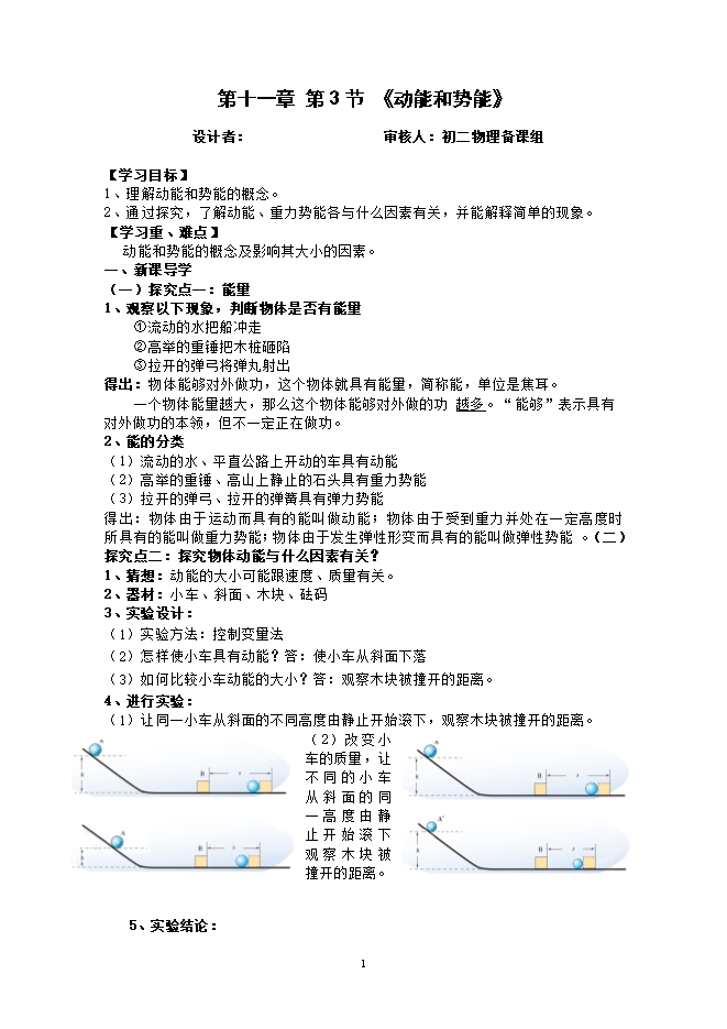 【内容简介】【学习目标】1、理解动能和势能的概念。2、通过探究,了解动能、重力势能各与什么因素有关,并能解释简单的现象。【学习重、难点】 动能和势能的概念及影响其大小的因素。一、新课导学(一)探究点一:能量1、观察以下现象,判断物体是否有能量①流动的水把船冲走②高举的重锤把木桩砸陷③拉开的弹弓将弹丸射出得出:物体能够对外做功,这个物体就具有能量,简称能,单位是焦耳。一个物体能量越大,那么这个物体能够对外做的功越多。“能够”表示具有对外做功的本领,但不一定正在做功。2、能的分类(1)流动的水、平直公路上开动的车具有动能(2)高举的重锤、高山上静止的石头具有重力势能(3)拉开的弹弓、拉开的弹簧具有弹力势能得出:物体由于运动而具有的能叫做动能;物体由于受到重力并处在一定高度时所具有的能叫做重力势能;物体由于发生弹性形变而具有的能叫做弹性势能。(二)探究点二:探究物体动能与什么因素有关?1、猜想:动能的大小可能跟速度、质量有关。2、器材:小车、斜面、木块、砝码3、实验设计:(1)实验方法:控制变量法(2)怎样使小车具有动能?答:使小车从斜面下落(3)如何比较小车动能的大小?答:观察木块被撞开的距离。4、进行实验:(1)让同一小车从斜面的不同高度由静止开始滚下,观察木块被撞开的距离。 (2)改变小车的质量,让不同的小车从斜面的同一高度由静止开始滚下观察木块被撞开的距离。 5、实验结论: (1)质量相同的物体,运动的速度越大,它的动能越越大;(2)运动速度相同的物体,质量越大,它的动能越大。6、补充:(1)p68想想议议:请你用物理知识解释,为什么要限速?为什么不同车型设定的最高行驶速度不一样?(2)p69小资料:分析一下质量和速度哪个对物体的动能影响更大?