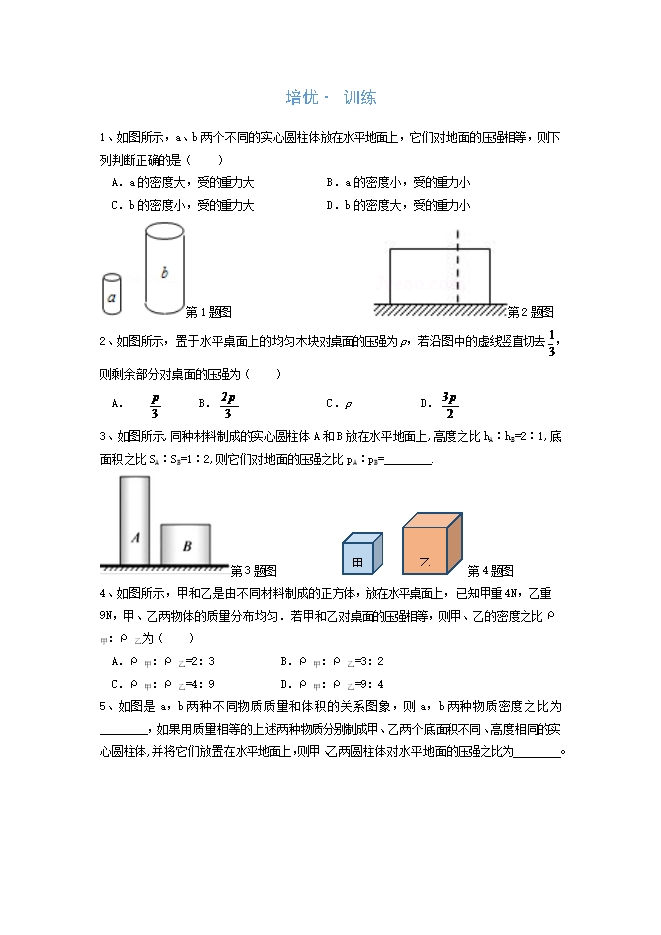 【内容简介】常用方法有:物理公式推导(定性、定量)、数学比例、极限法、分解法、赋值法等。1、根据题目提供的已知条件判断出两个物体原来的密度、压力、压强的大小关系:可根据 P=F/S、 P=ρgh或ρ=m/V等判断。2、根据要求的未知物理量,确定压强、压力的变化情况,变化量(ΔP、ΔF)。3、结合题目找出改变(增大或减小)ΔP、ΔF的方法。①变化的压强可以用ΔP=ΔF/S (对于柱类物体也可用ΔP=ρgΔh)或ΔP=P1-P2等分析计算;②变化的压力可以用ΔF=Δmg 、 ΔF=ΔPS 、 ΔF=mg/n( n为比例)或ΔF=F1-F2等分析计算;③柱形物体或液体的压强均可以用P=F/S 或 P=ρgh判断,要看题目提供的条件。分析此类问题应用的知识多,综合性强,应熟练掌握质量、重力、压力、密度、压强及体积、面积等有关知识。